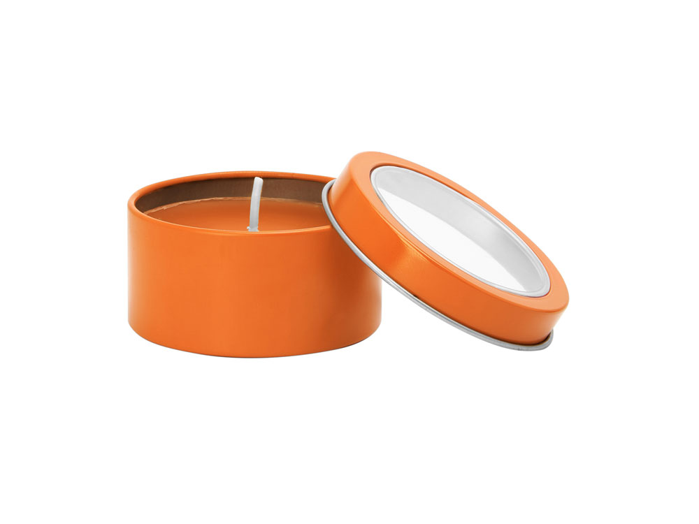 Ароматическая свеча с запахом ванили в металлическом круглом подсвечнике с крышкой с прозрачным окошком. Цвет свечи в тон подсвечника. белый фитиль