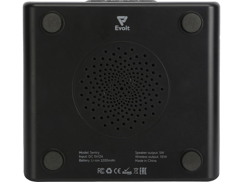 Беспроводная колонка с часами и функцией беспроводной зарядки Sentry от Evolt. Устройство может работать автономно, что позволяет использовать его в любой точке квартиры и за ее пределами и избавиться от проводов на рабочем столе. Колонка подключается к смартфону при помощи Bluetooth, имеет большой динамик, занимающий собой всю нижнюю панель Sentry.