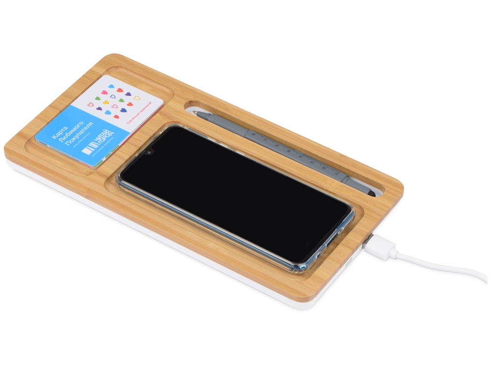 Органайзер Timber с функцией беспроводной зарядки — современный и стильный бизнес-подарок для поклонников экодизайна. Подойдет для хранения смартфона, ручки и визитных или клубных карт. Лаконичный дизайн с выраженной текстурой бамбука позволяет аксессуару гармонично вписаться практически в любой интерьер. В комплект входит кабель USB-C. Дополнительный плюс — выходной разъем USB. Гравировка (CO2 лазер) (Без чернения) на данный товар осуществляется бесплатно. Оплачивается только настройка оборудования в размере 1000 рублей на весь тираж.