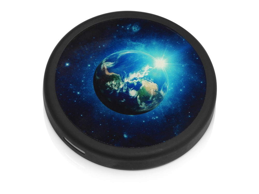Благодаря миниатюрному размеру устройства и идеальной форме круга, вы не сразу угадаете его назначение. Этот предмет создан для тех, кто предпочитает гармонично встраивать технологии в ежедневную жизнь, деликатно скрывая их под маской обычных вещей. Главная функция устройства — беспроводная зарядка — реализуется качественно и бесперебойно. В комплекте с изделием в разобранном виде поставляется круглое закаленное стекло, на котором можно сделать красочное нанесение любого изображения. После запечатки стекло легко крепится на корпус устройства.