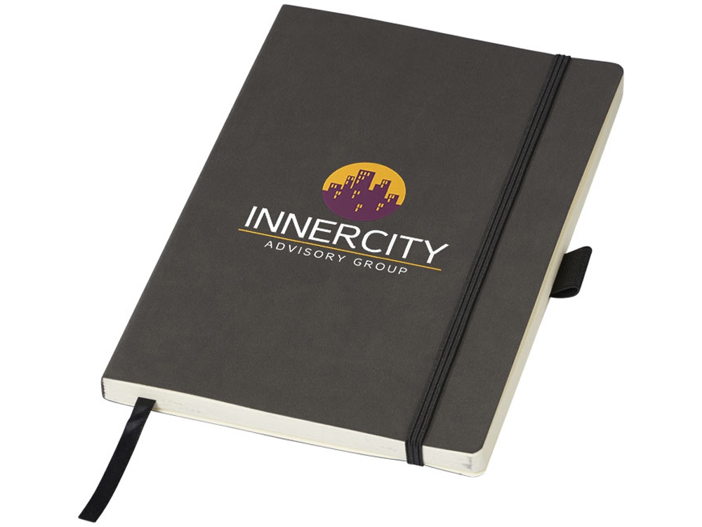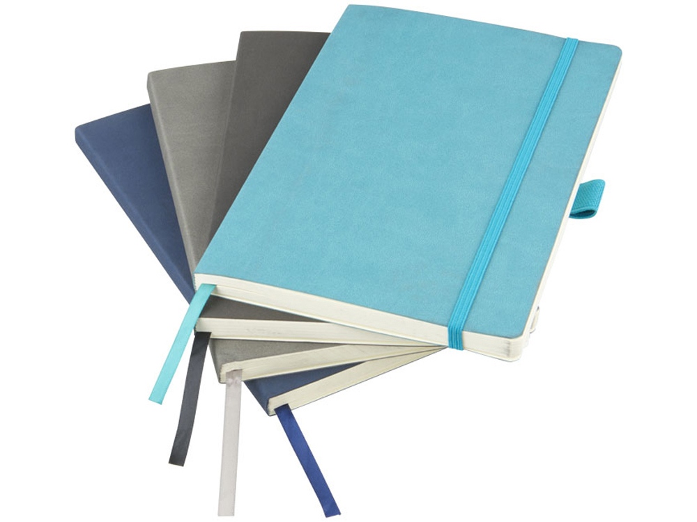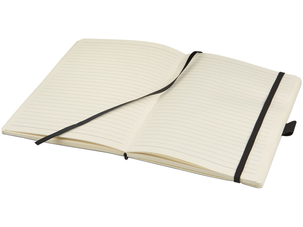 Блокнот Revello. Мягкий на ощупь, гибкий блокнот (размер А5 для ориентации) со встроенной эластичной застежкой, закладкой, петелькой для ручки и кармашка для документов на внутреннем форзаце сзади. 80 листов кремовой линованной бумаги (80г/м2). Упакован в черную коробку-рукав. Кожа ПУ. Тиснение (Блинт) на данный товар осуществляется бесплатно. Оплачивается только настройка оборудования в размере 6200 рублей на весь тираж.
