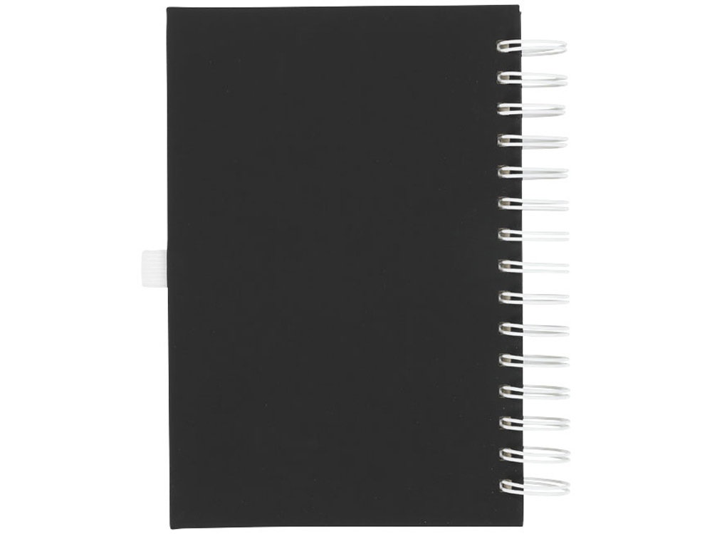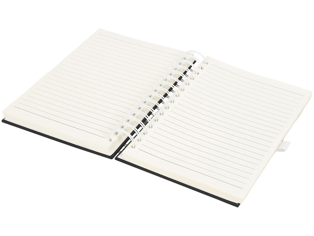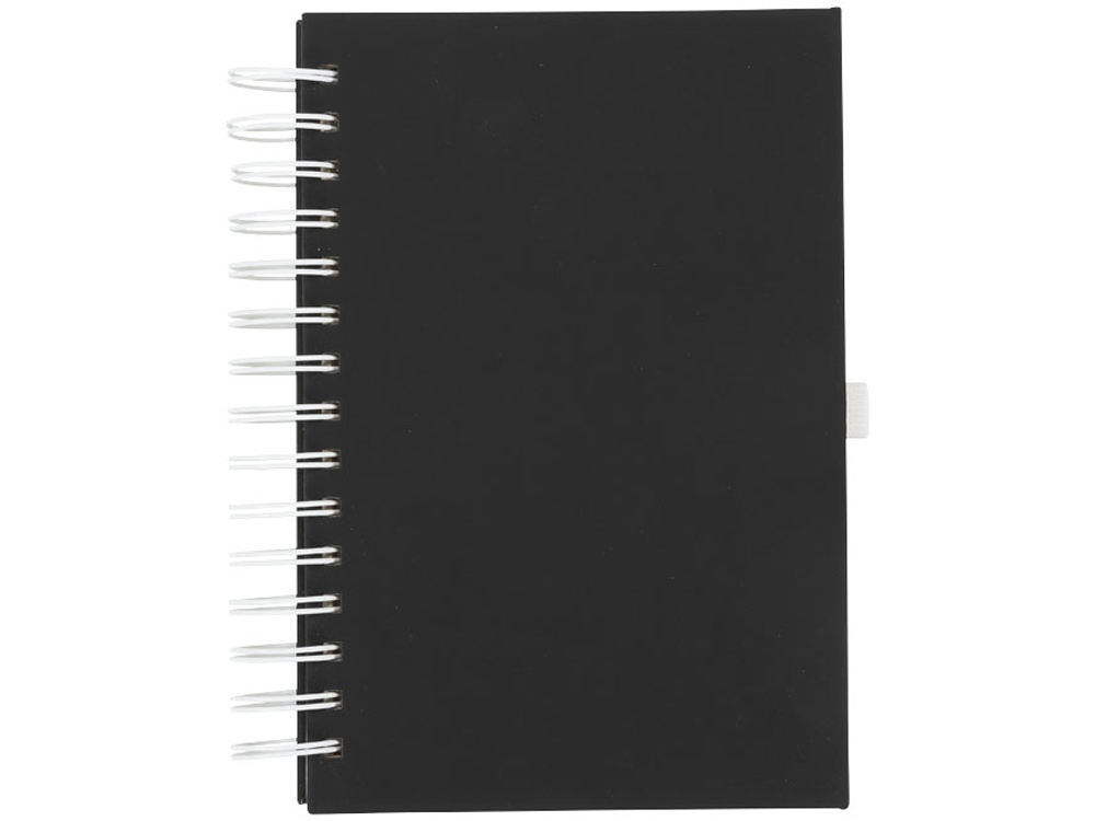 Блокнот Wiro. Новинка в нашей популярной коллекции блокнотов. В этом универсальном новом блокноте есть гладкая черная обложка из ПУ, цветная спираль и застежка-держатель для ручки. Содержит 160 листов линованной бумаги (70 г/м²) кремового цвета. Обложка из ПУ с металлической спиралью. Тиснение (Блинт) на данный товар осуществляется бесплатно. Оплачивается только настройка оборудования в размере 6200 рублей на весь тираж.