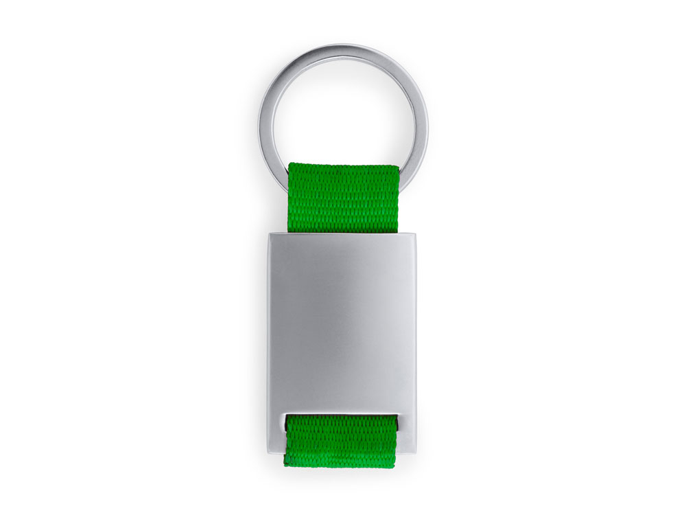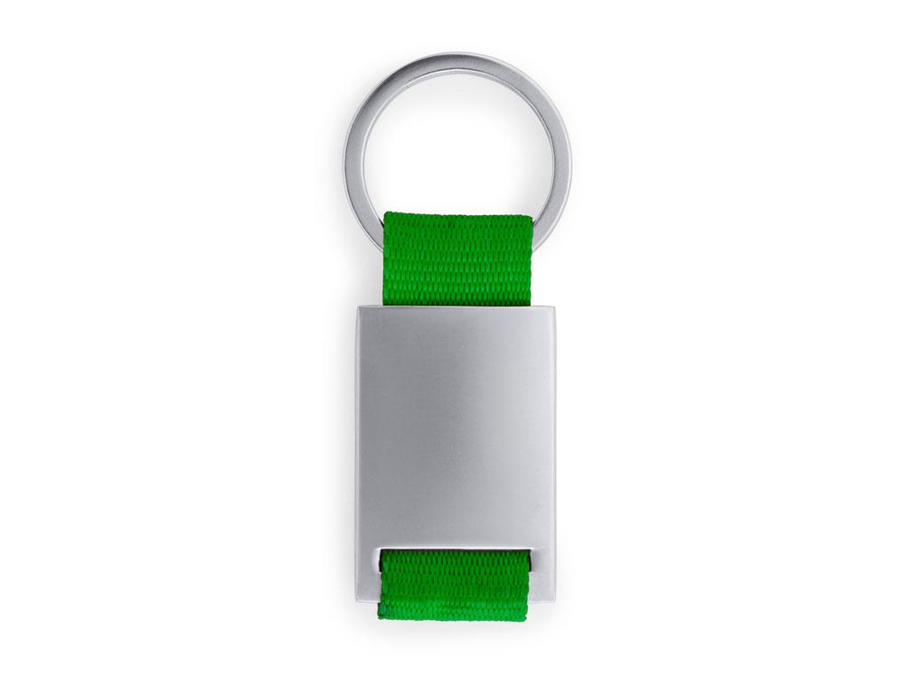 Металлический брелок с цветной полосой из полиэстера.