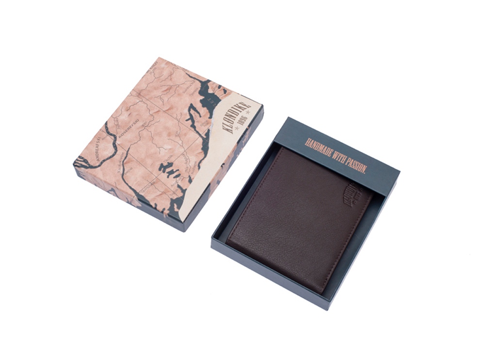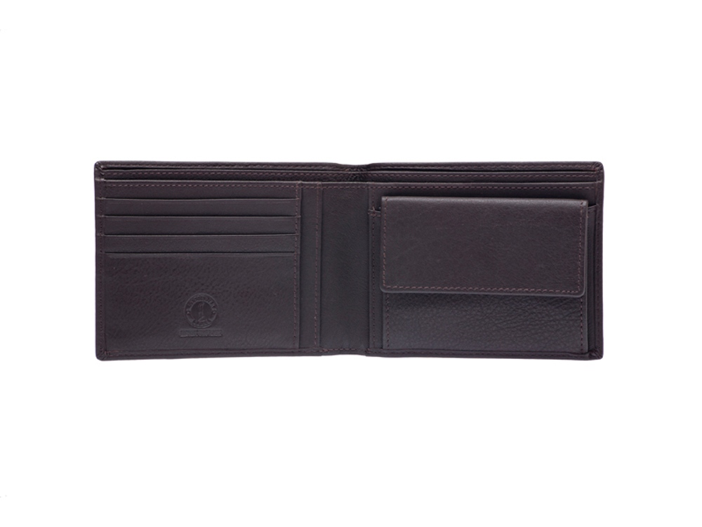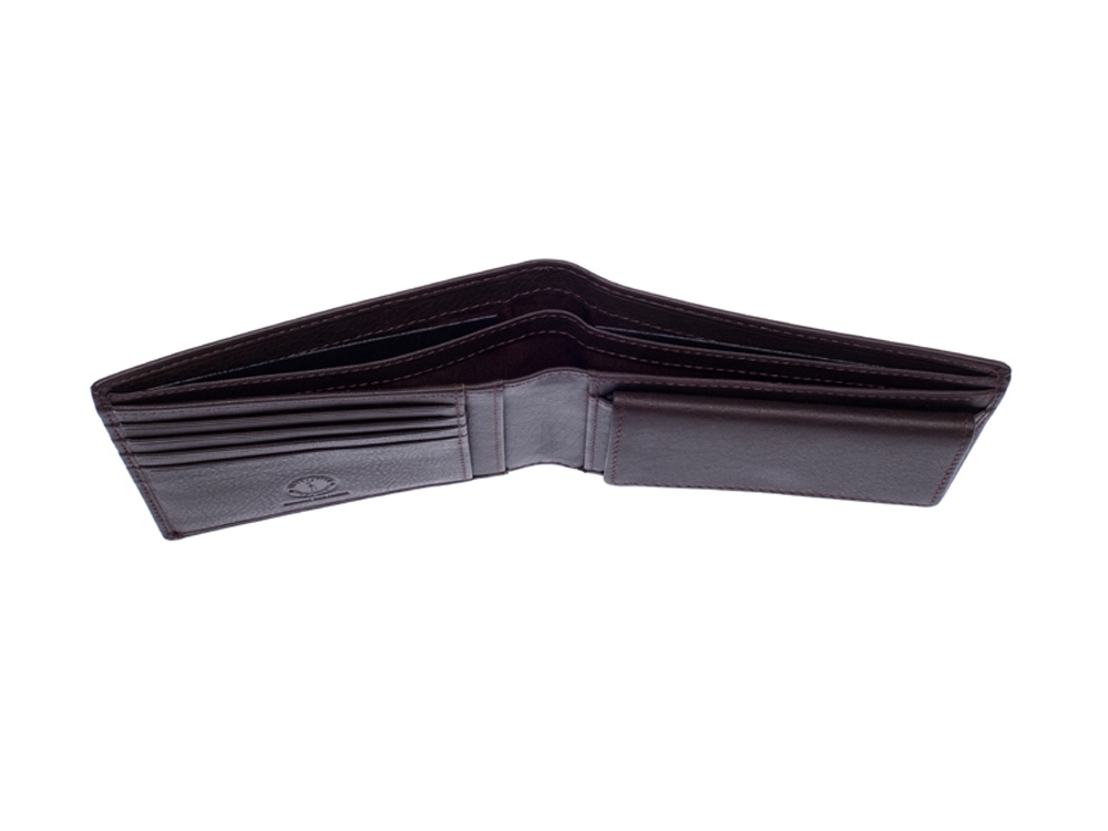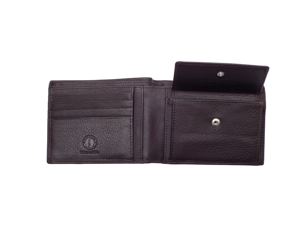 Бумажник мужской серии «Claim», включает в себя четыре отделения для кредитных карт, три боковых скрытых отделения, одно отделение для монет, закрывается на кнопку, два отделения для купюр, позволяющие хранить купюры в развернутом виде.