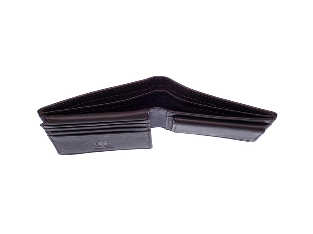 Бумажник мужской серии «Claim», включает в себя восемь отделений для кредитных карт, два боковых скрытых отделения, одно скрытое сетчатое отделение, одно отделение для монет, закрывается на кнопку, два отделения для купюр, позволяющие хранить купюры в развернутом виде.