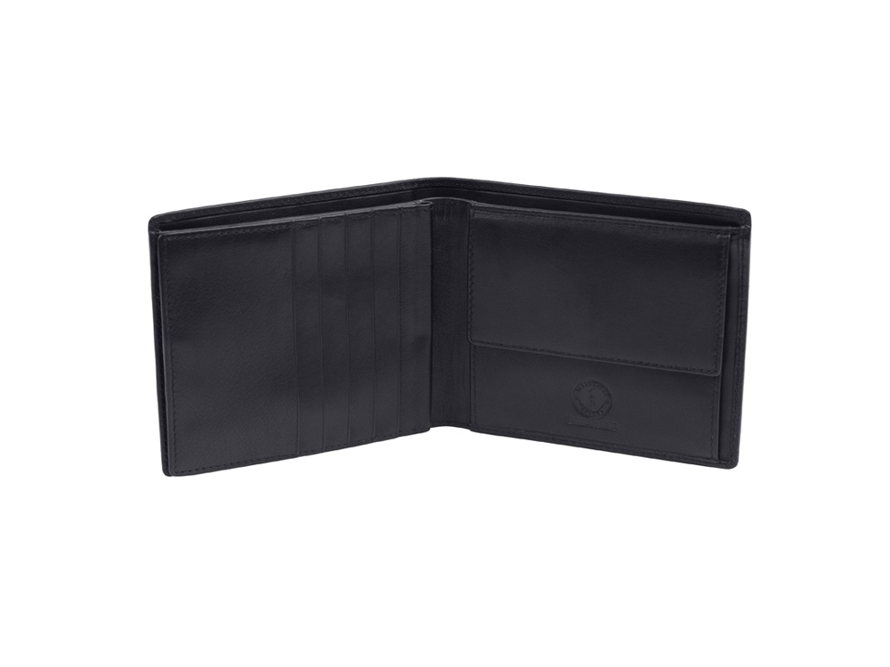 Бумажник мужской серии «Claim», включает в себя девять отделения для кредитных карт, пять из них закрываются на кнопку, три боковых скрытых отделения, одно скрытое сетчатое отделение, закрывается на кнопку, одно отделение для монет, закрывается на кнопку, два отделения для купюр, позволяющие хранить купюры в развернутом виде.