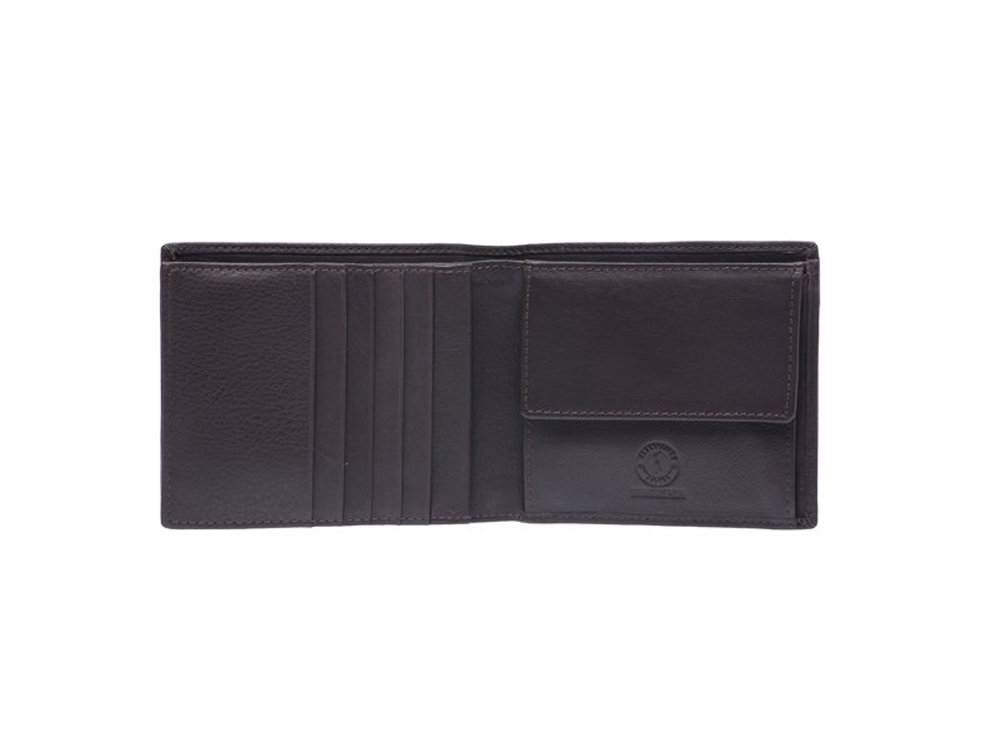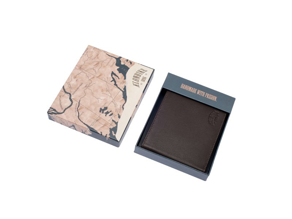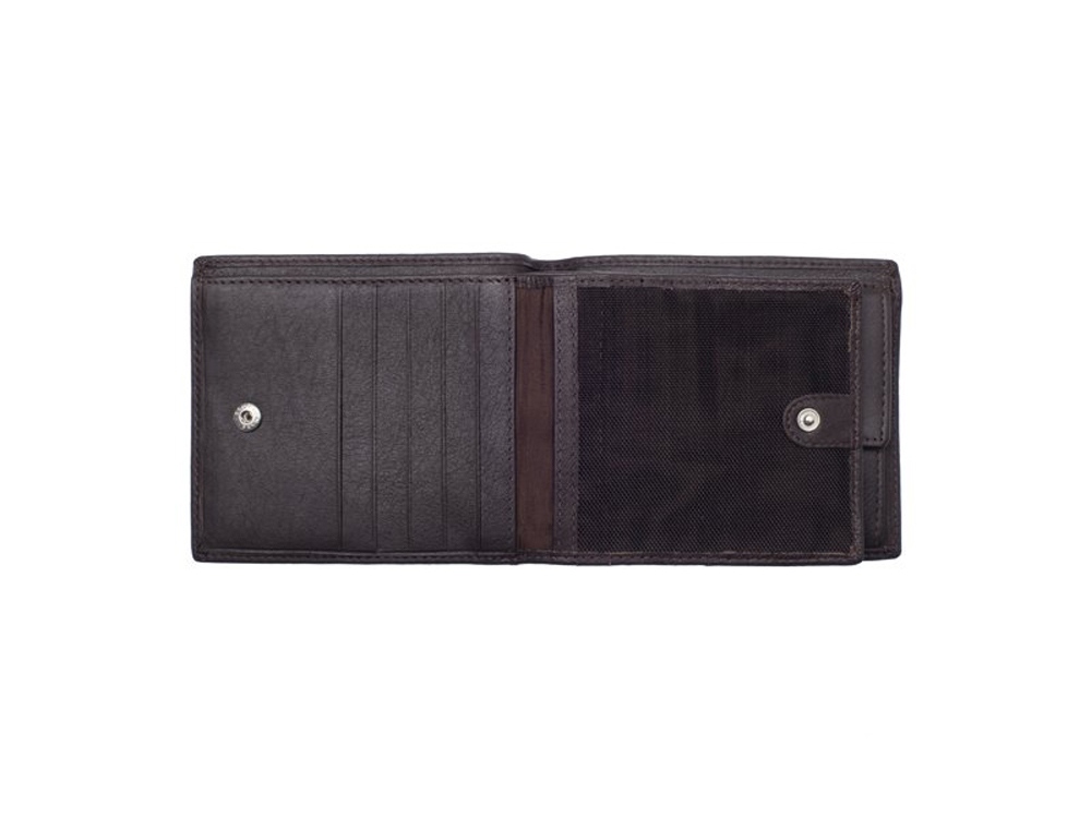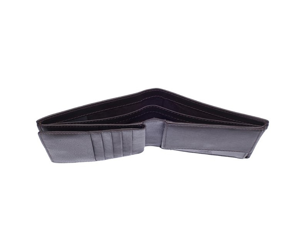 Бумажник мужской серии «Claim», включает в себя девять отделения для кредитных карт, пять из них закрываются на кнопку, три боковых скрытых отделения, одно скрытое сетчатое отделение, закрывается на кнопку, одно отделение для монет, закрывается на кнопку, два отделения для купюр, позволяющие хранить купюры в развернутом виде.