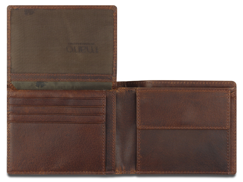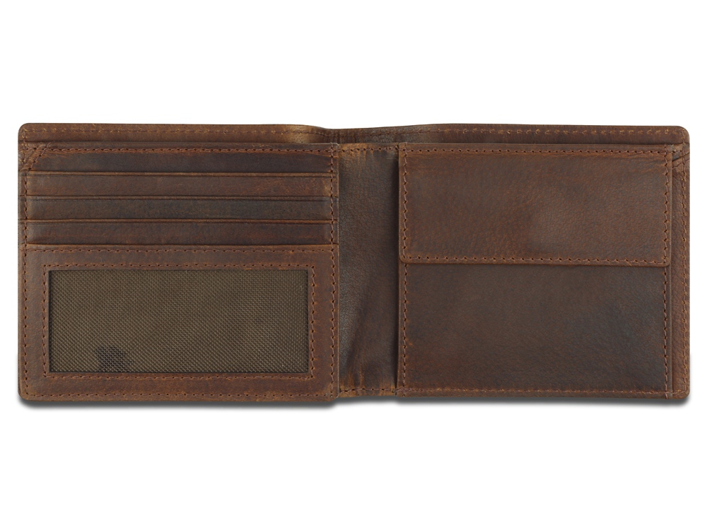 Бумажник изготовлен вручную из натуральной кожи буйвола, обеспечивает безопасное хранение купюр, кредитных карт и монет.