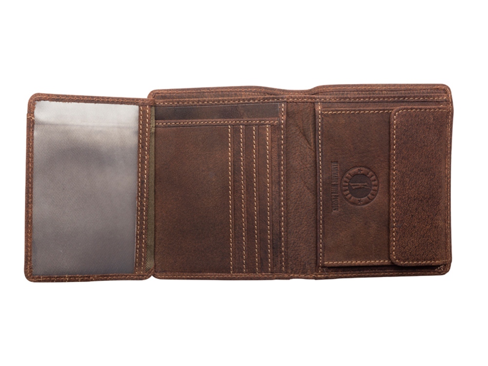 Бумажник мужской «Eric»,включает в себя восемь отделений для кредитных карт, одно отделение с прозрачным окошком, четыре скрытых боковых отделений, два отделения для купюр, позволяющие хранить купюры в развернутом виде, одно отделение для монет, закрывается на кнопку.