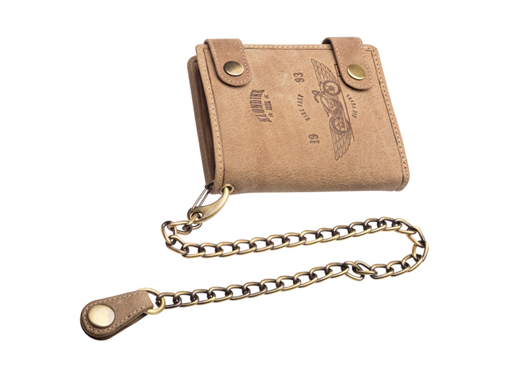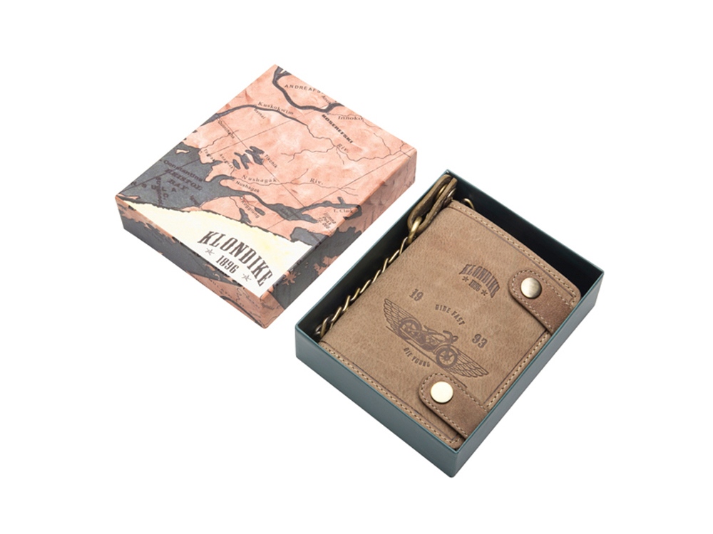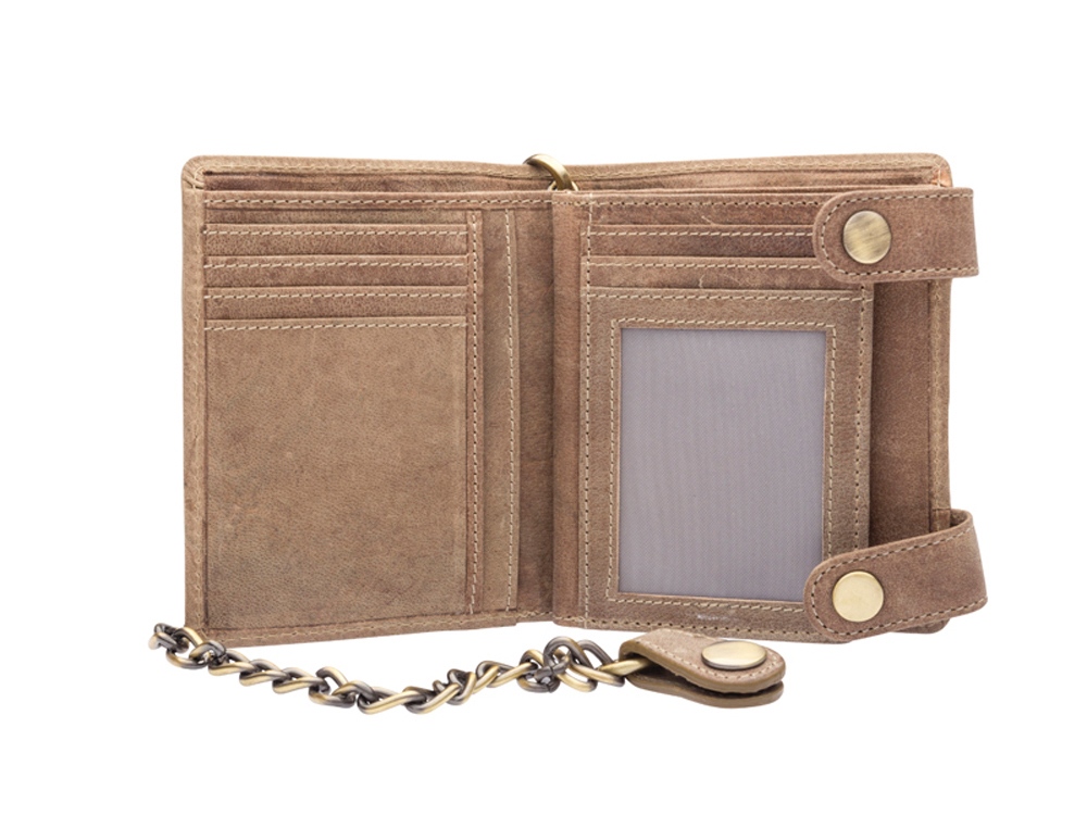 Бумажник мужской «Tim Bike» с металлической цепью и тиснением в виде мотоцикла, закрывается на 2 заклепки, включает в себя отделений для кредитных карт, два отделение с прозрачным окошком, три скрытых отделения, одно дополнительное скрытое отделение на молнии, два отделения для купюр, позволяющие хранить купюры в развернутом виде, одно отделение для монет, закрывается на кнопку.