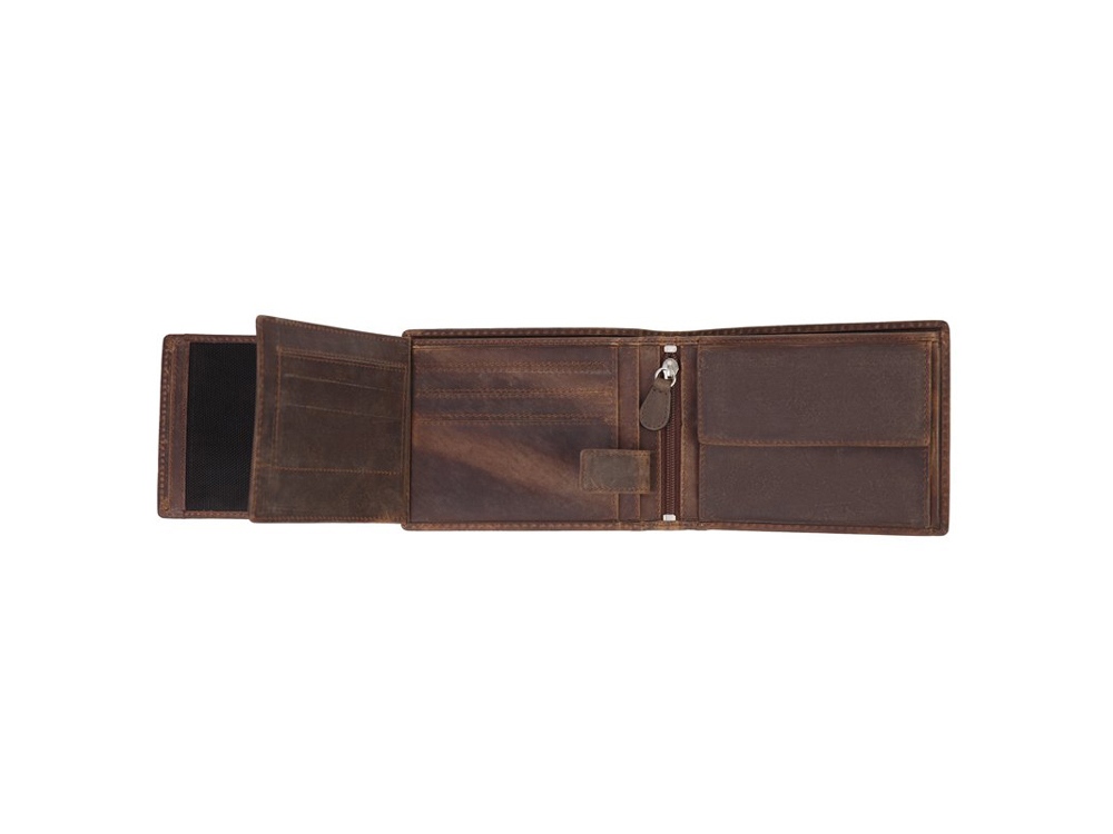Бумажник мужской серии «Yukon», включает в себя семь отделений для кредитных карт, закрываются на кнопки, три боковых скрытых отделения, два боковых скрытых сетчатых отделения, закрывается на кнопку, одно отделение для монет, закрывается на кнопку, одно дополнительное скрытое отделение на молнии, два отделения для купюр, позволяющие хранить купюры в развернутом виде.