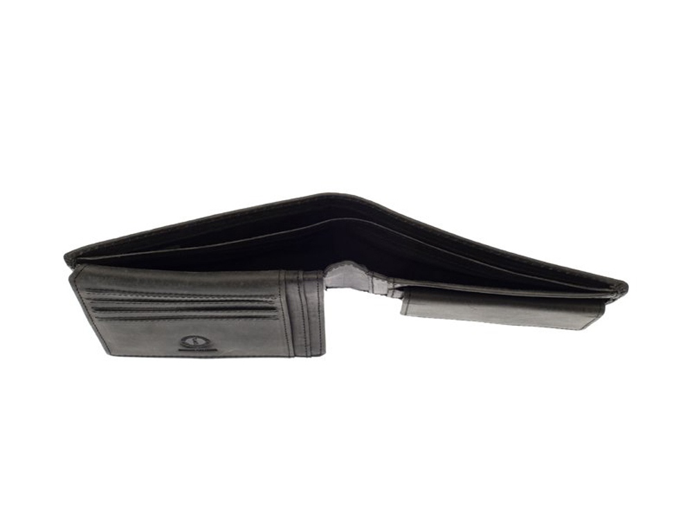 Бумажник мужской серии «Yukon», включает в себя восемь отделений для кредитных карт, и, семь боковых скрытых отделений, одно скрытое сетчатое отделение, одно отделение для монет, закрывается на кнопку, два отделения для купюр, позволяющие хранить купюры в развернутом виде.