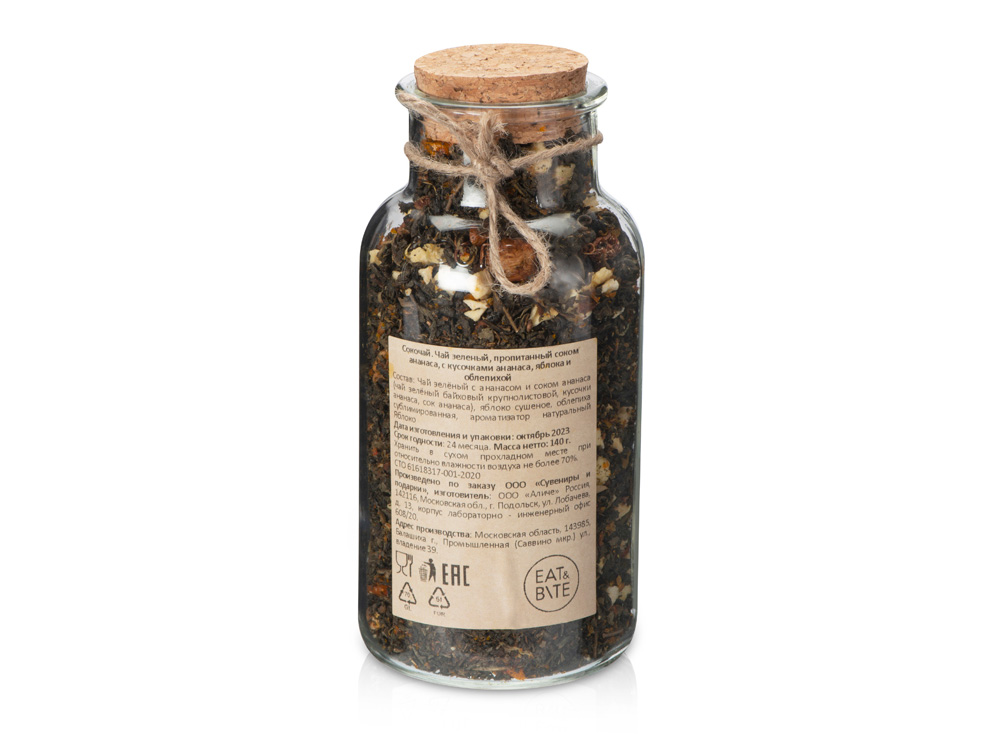 Состав: чай зелёный с ананасом и соком ананаса (чай зелёный байховый крупнолистовой, кусочки ананаса, сок ананаса), яблоко сушеное, облепиха сублимированная, ароматизатор натуральный «Яблоко». Тампопечать (1 цвет (цветные изделия)) на данный товар осуществляется бесплатно. Оплачивается только настройка оборудования в размере 4000 рублей на весь тираж.