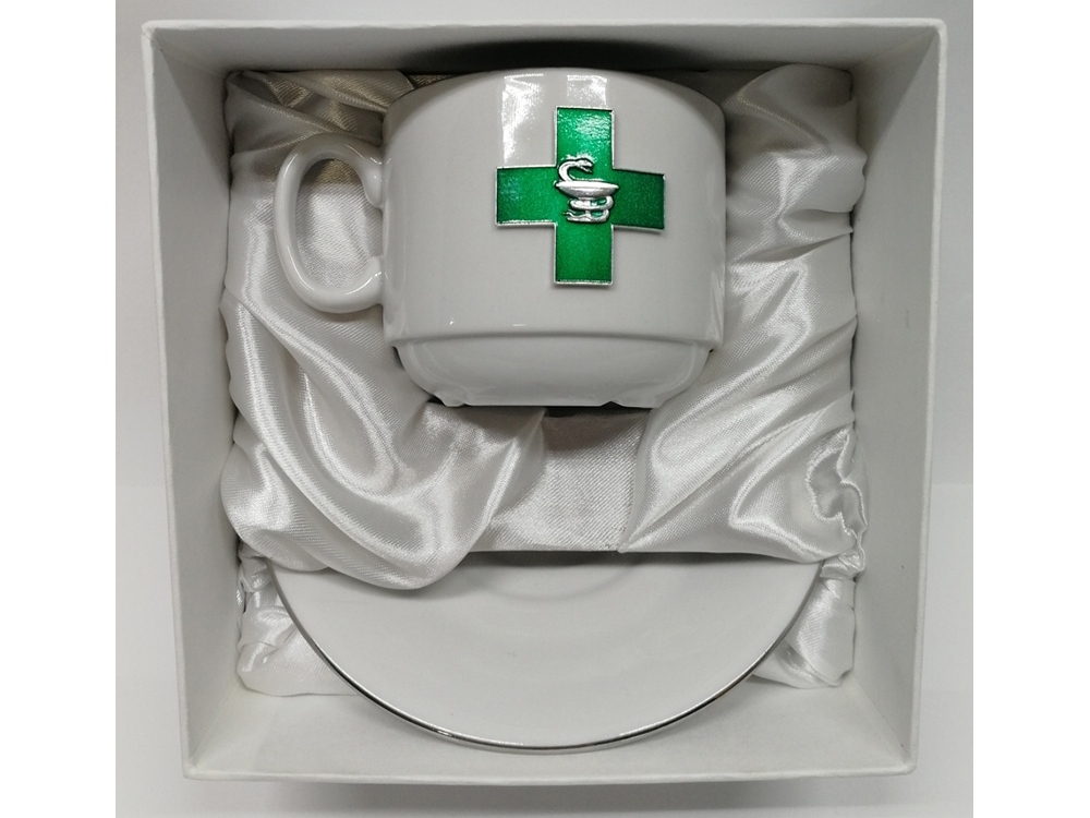 Чайная пара из фарфора авторской ручной работы. Набор состоит из чашки и блюдца. Емкость чашки — 220 мл. Она декорирована символом фармацевта — зеленым крестом с изображением змея, обвивающего чашу. Подойдет в качестве подарка работникам медицины и фармацевтики. Поставляется в подарочной упаковке из переплетного картона, оклеенного дизайнерской бумагой и атласным ложементом.