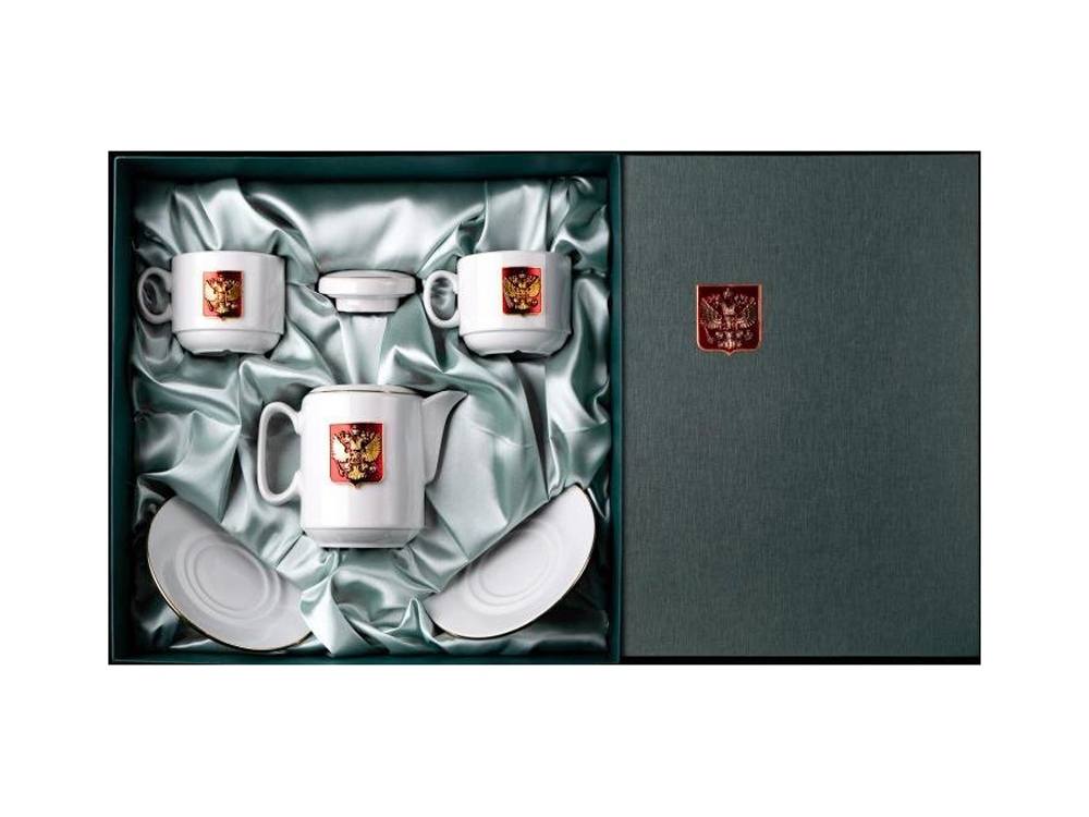 Подарочный набор фарфоровый с чайником «Россия». Фарфоровый чайник и две фарфоровые чайные пары с золотой отводкой края чашки и блюца декорированная металлическим барельефом «Двуглавый орел». Материал барельефа сплав алюминия с декоративным покрытием «под золото» и отделкой эмалью. Емкость чашек 220 мл., ёмкость чайника 500 мл. Ручная работа.