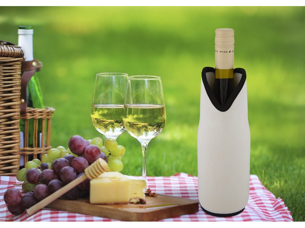 Держатель-рукав из переработанного неопрена для бутылки с вином с тонкой прострочкой и дополнительной изоляцией, которая сохраняет вино прохладным в течение длительного времени и с помощью которой держать бутылку гораздо удобнее. Держатель растягивается, поэтому подойдет под любой размер бутылки и будет плотно ее удерживать. Он также не даст бутылке разбиться во время транспортировки.
