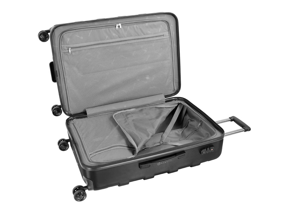 Galatea — наша неповторимая серия чемоданов с рельефно нанесённым на корпус большим логотипом Bugatti. Вся товарная линейка представлена в классическом чёрном цвете. Благодаря корпусу, сделанному из смеси АБС-пластика и поликарбоната, каждая модель отличается лёгким весом и повышенной прочностью. Четыре резиновых колеса с бесшумным ходом и возможностью поворота на 360° обеспечивают ровное движение. Лёгкая телескопическая ручка эргономичной формы фиксируется в нескольких положениях для удобства пользователей с разным ростом. Замок TSA с трехзначным кодом идеально подходит для защиты содержимого багажа от несанкционированного вскрытия. Дополнительная ручка на дне корпуса облегчает загрузку и выгрузку чемодана. Сетчатые разделительные стенки на молнии растягиваются для удобства упаковки, а фиксирующие ремни охватывают большую поверхность и обеспечивают сохранность сложенных вещей.