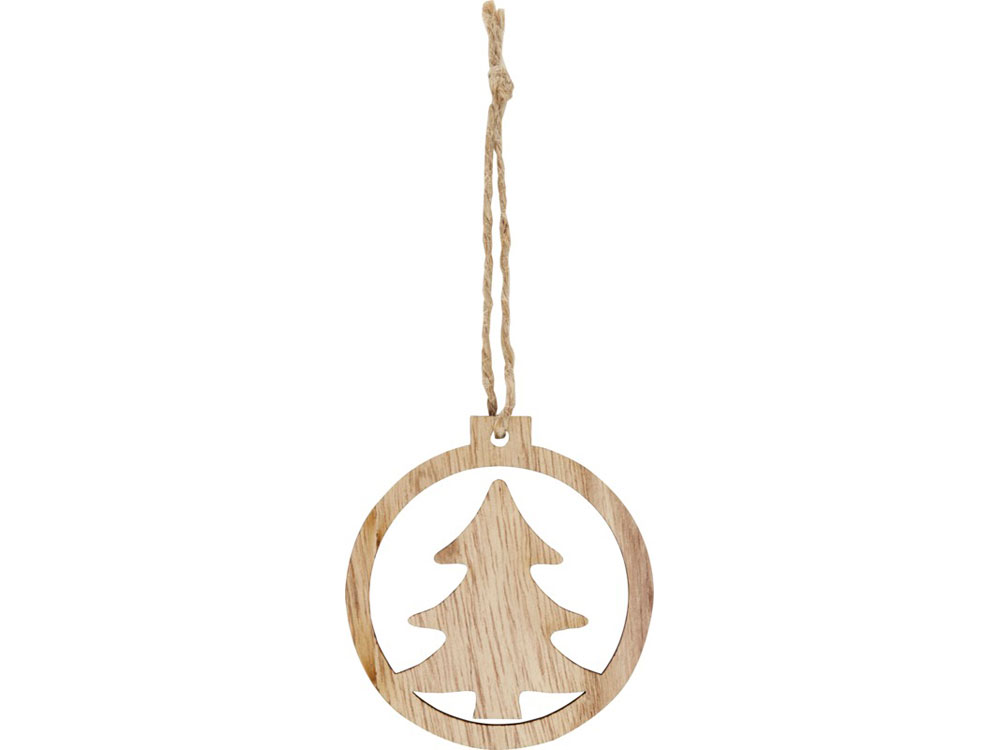 Деревянное украшение круглой формы с елкой внутри, с петлей и шнурком. Упаковано с открыткой из крафт-бумаги на обратной стороне.