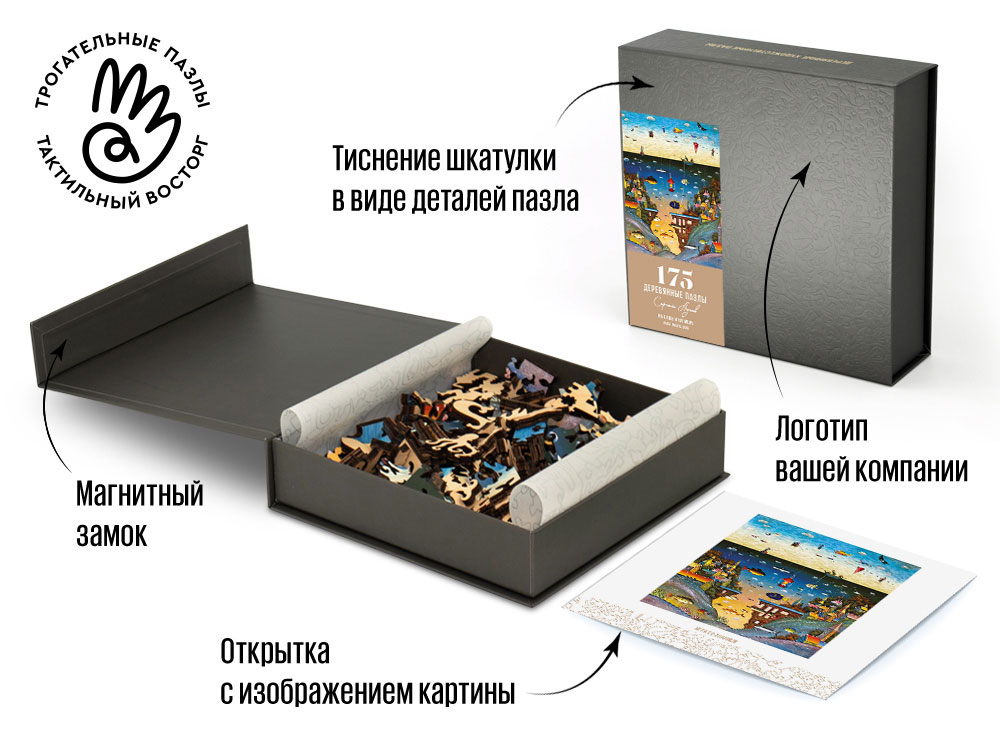 Головоломка поставляется в сером футляре из дизайнерского картона с магнитным замком, который можно брендировать вашим логотипом. Крышка футляра снабжена наклейкой с изображением картины для облегчения сборки.
