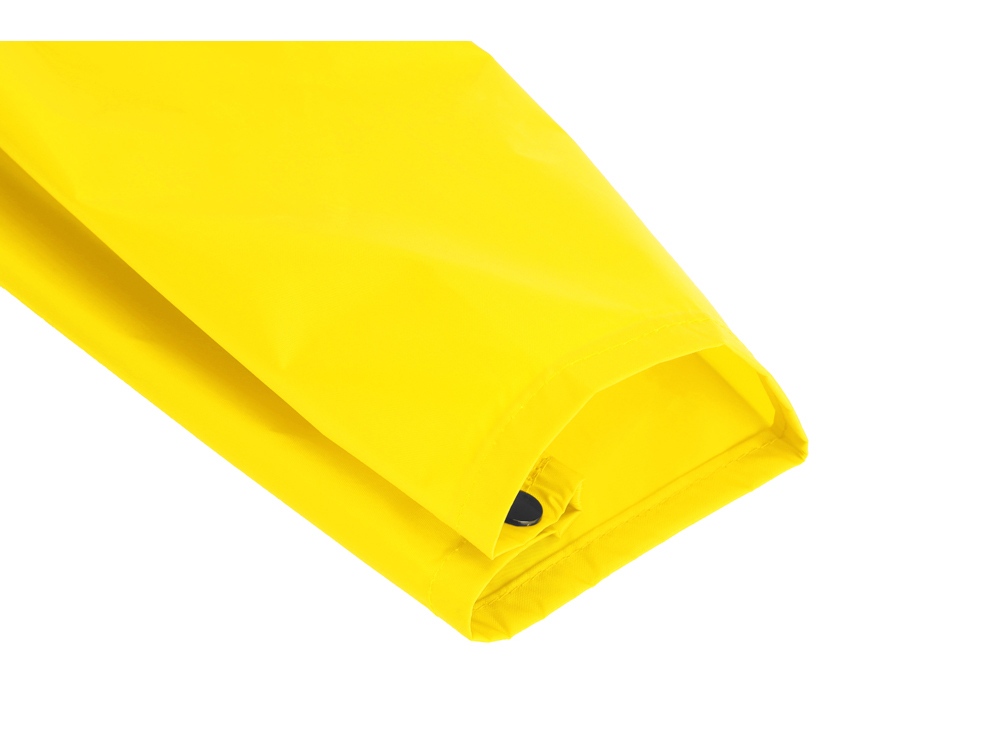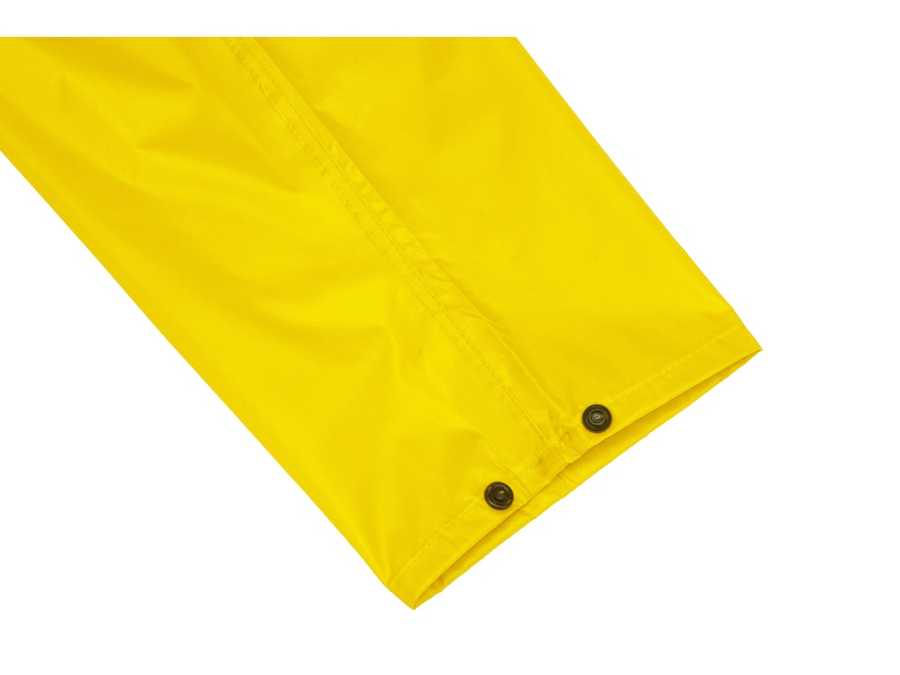 Длинный дождевик выполнен из полиэстера с водоотталкивающей пропиткой. Застегивается на молнию, поверх которой — планка на кнопках, что дополнительно защищает от ветра и промокания. Посадку капюшона можно регулировать при помощи шнурка, ширина рукава регулируется кнопкой.