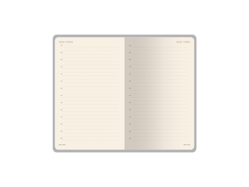 раздел для планирования имеет линовку серого цвета с указанием времени (интервалы в один час) и выполнен из бежевой бумаги плотностью 70 г/кв.м;
