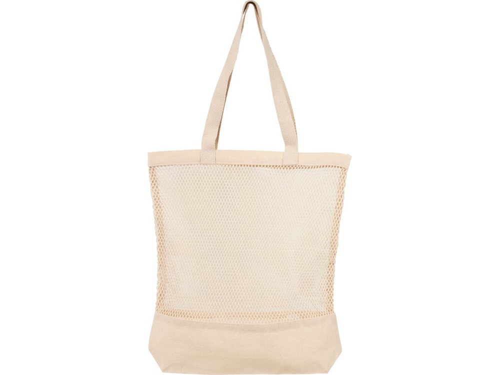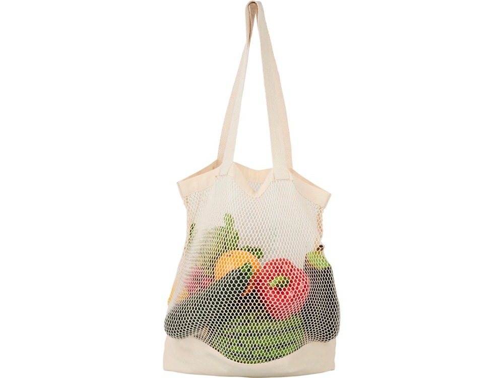 Эко-сумка Maine из сетчатого хлопка. Сумка для фруктов и овощей из сетчатого хлопка для многоразового использования. Имеет две свисающие ручки высотой 27,5 см. Вместимость: 12 литров, прочность до 10 кг. Хлопок 170 г/м².