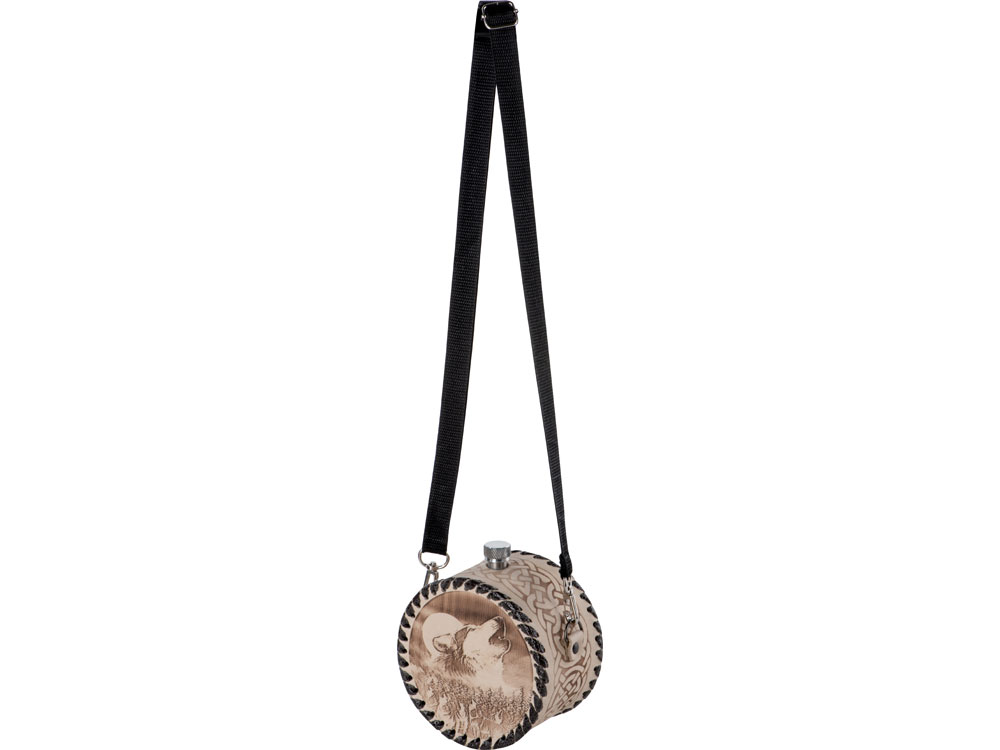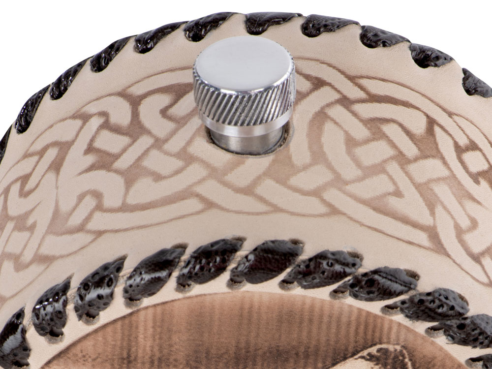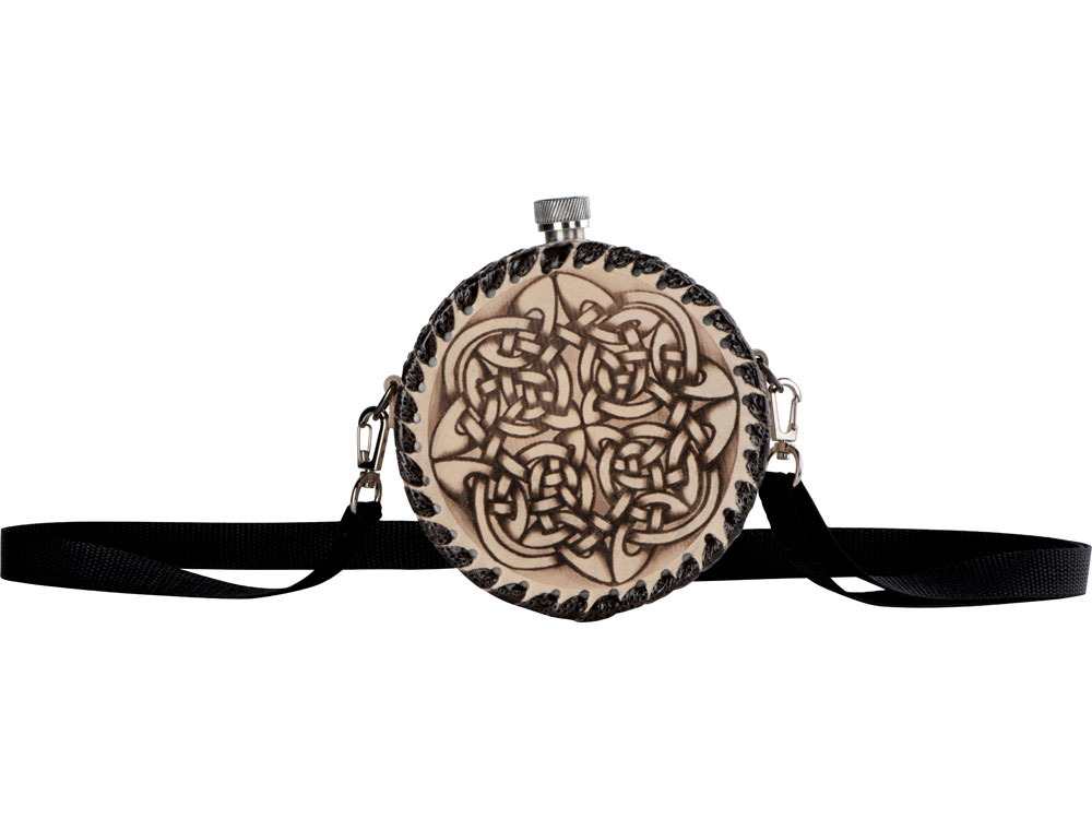 Фляга 1л в оплетке из натуральной кожи с нанесением рисунка методом художественного выжигания.