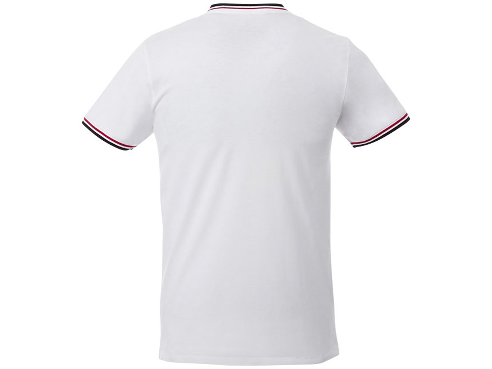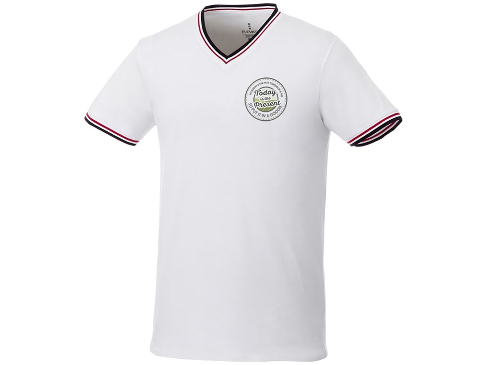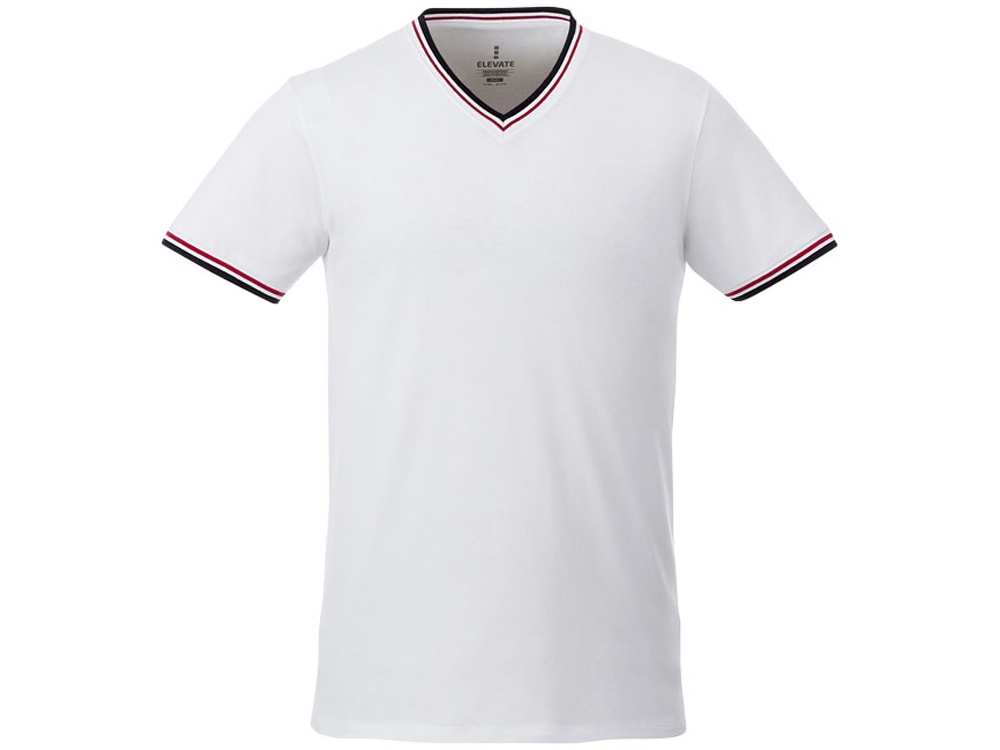 Мужская футболка Elbert с коротким рукавом. Воротник гладкой вязкой в рубчик. Манжеты гладкой вязкой в рубчик. Контрастные окантовки.V-образная горловина. Двойная строчка на воротнике и внизу изделия. Комфортный ярлык-трансфер на изделии. Трикотажное пике, 100% хлопок. 180 г/м².
