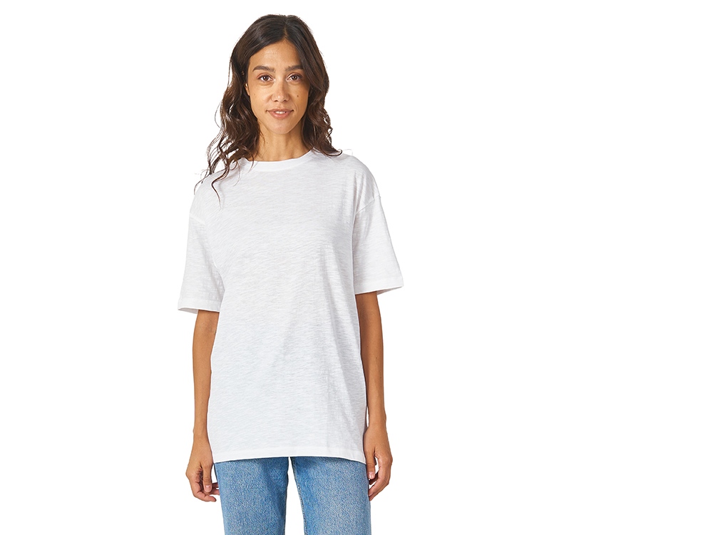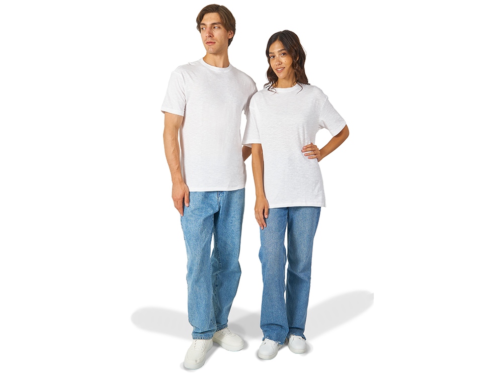 Полотно футболки имеет необычную структуру — с протяжками, но при этом гладкую поверхность, что обеспечивает идеальную поверхность для нанесения: прямая печать, трафаретная или термотрансфер прекрасно ложатся на такое полотно. Декоративная отстрочка по низу рукавов и изделия, а также отстрочка по горловине позволяют футболке дольше сохранять форму.