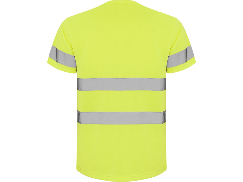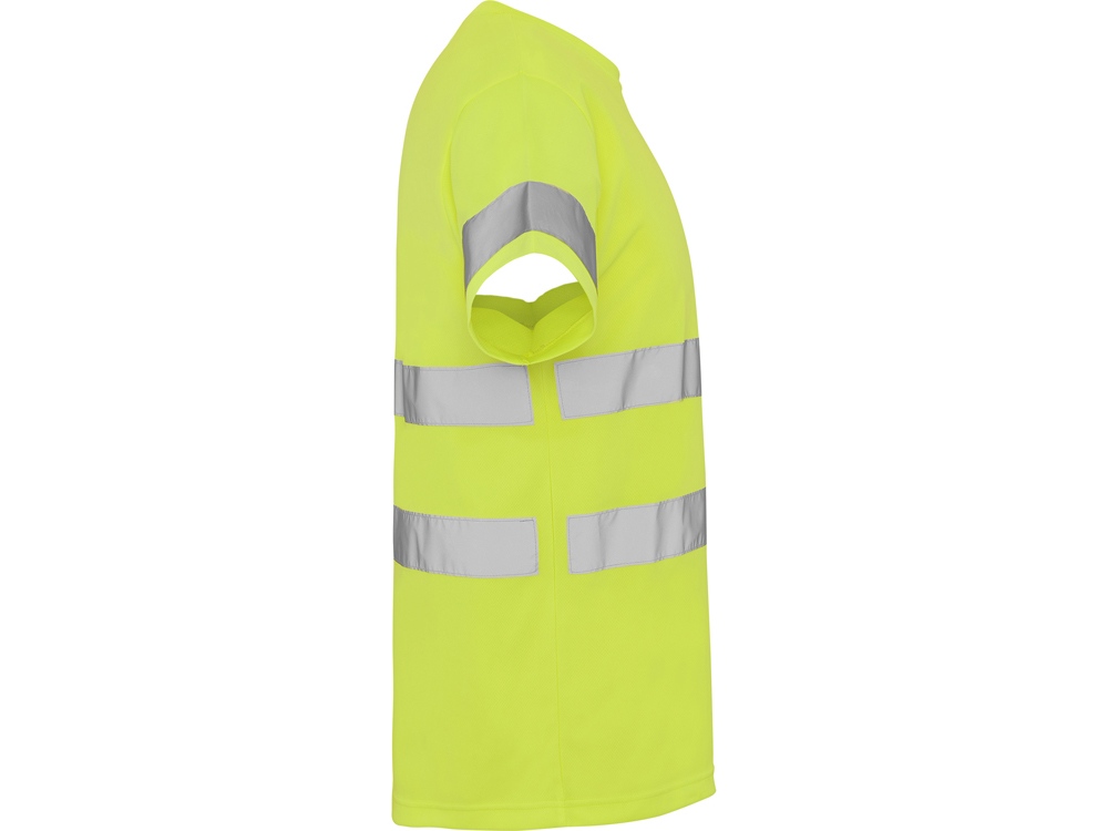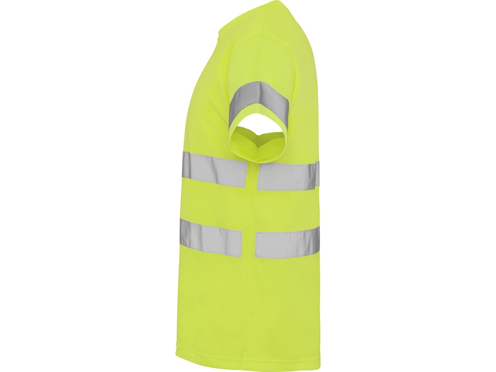 Футболка со светоотражающими элементами с короткими рукавами. Круглая горловина из той же ткани, с усиленными закрытыми швами на внутренней стороне горловины. Две горизонтальные светоотражающие полосы на туловище и одна светоотражающая полоса на рукавах.