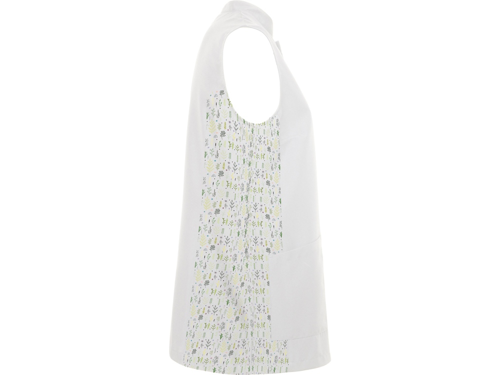Жилетка без рукавов. Застежка спереди со скрытыми кнопками-застежками. Воротник-стойка, боковые вставки и складки в области груди. Два передних накладных кармана.