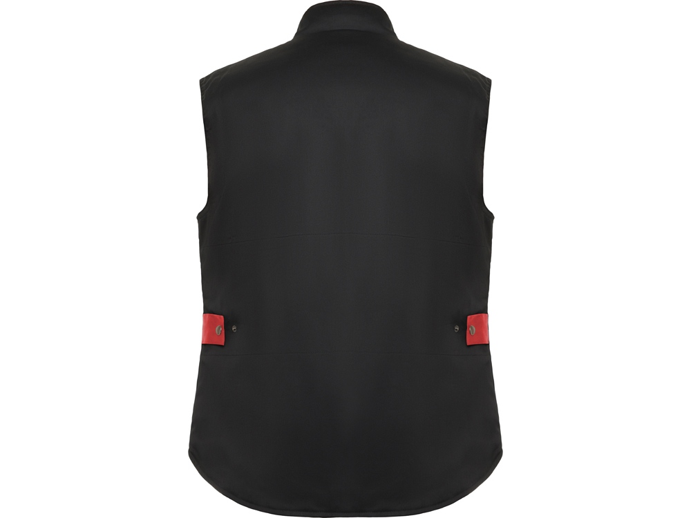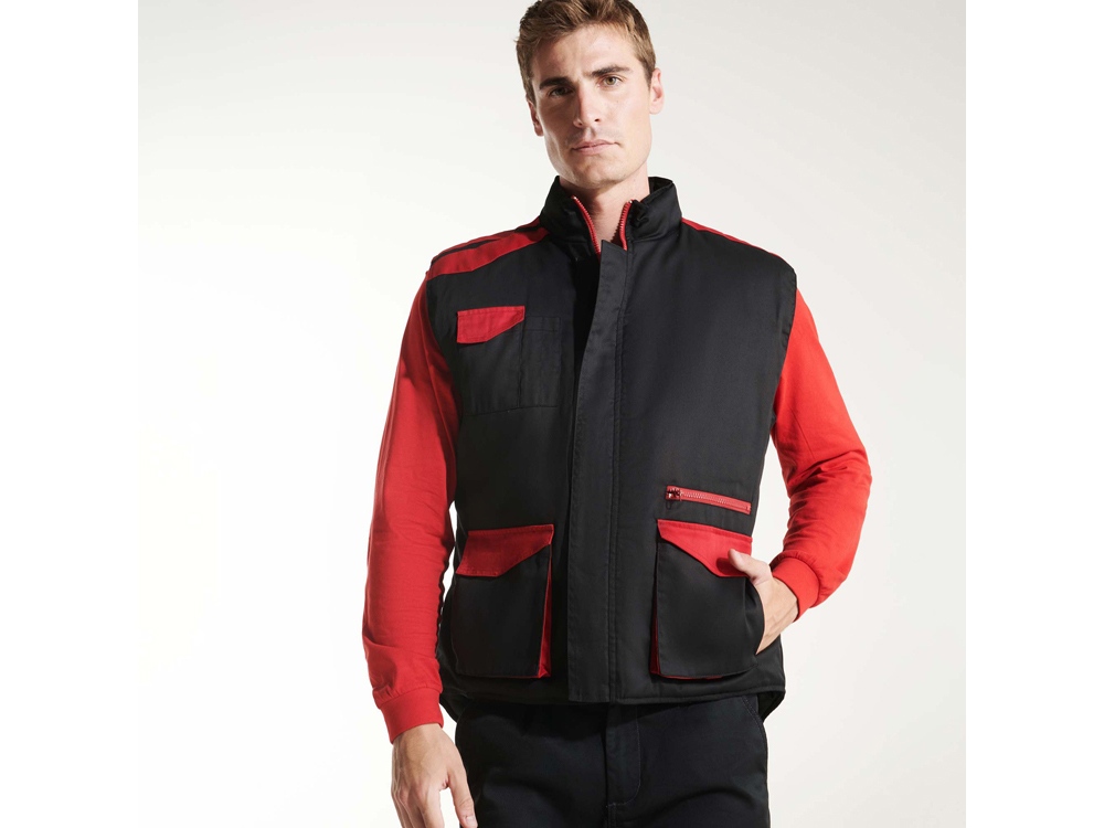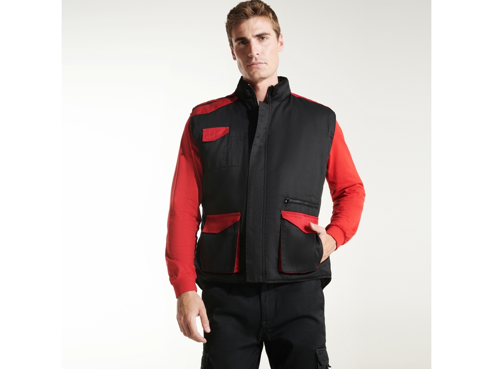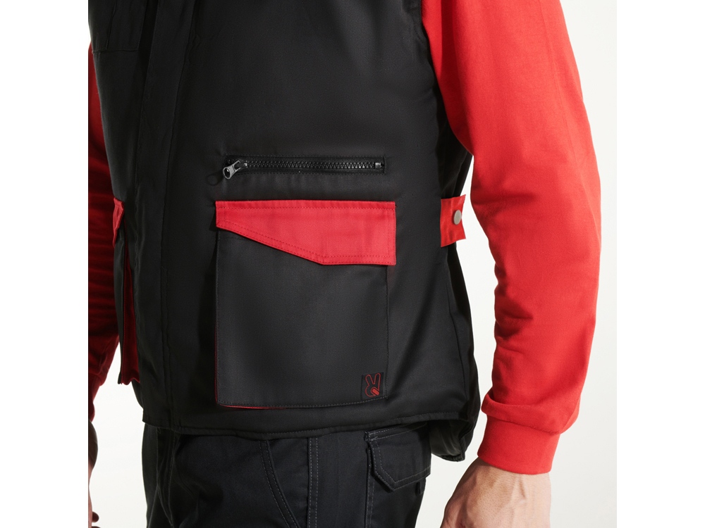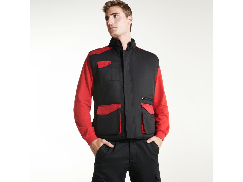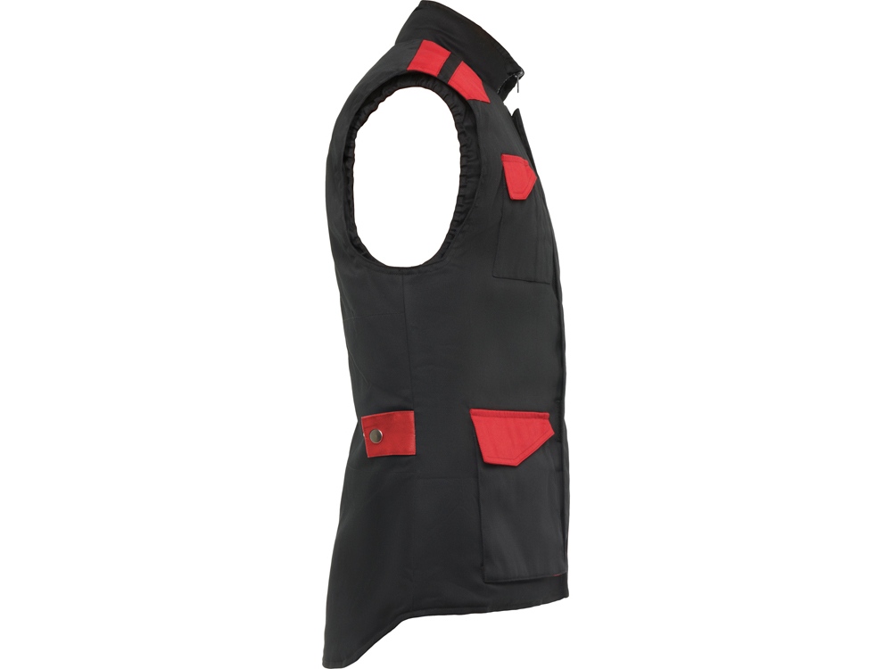 Рабочий жилет в двухцветной комбинации с несколькими карманами и высоким воротником.