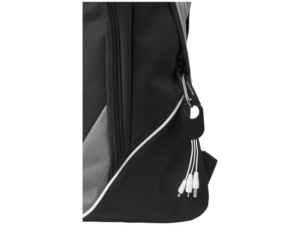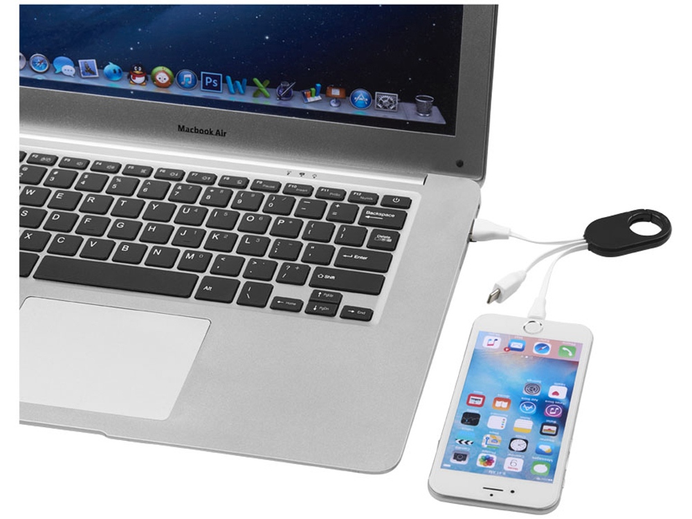 Кабель для зарядки «3-в-1». Кабель для зарядки Troop «3-в-1» с коннектором USB Type C и двойным совместимым коннектором «2-в-1» для устройств Apple® iOS и Android. Кабель оснащен карабином для удобного крепления к сумке. АБС-пластик. Тампопечать (1 цвет (цветные изделия)) на данный товар осуществляется бесплатно. Оплачивается только настройка оборудования в размере 4000 рублей на весь тираж.