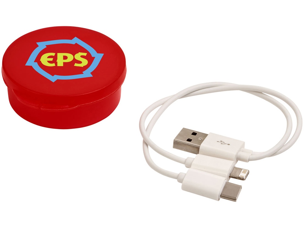Кабель для зарядки Versa «3-в-1» в футляре. Кабель для зарядки Versa «3-в-1» в круглом футляре с кабелем USB с несколькими коннекторами, включая USB Type C и двойной совместимый коннектор «2-в-1» для устройств Apple® iOS и Android. АБС-пластик. Тампопечать (1 цвет (цветные изделия)) на данный товар осуществляется бесплатно. Оплачивается только настройка оборудования в размере 4000 рублей на весь тираж.