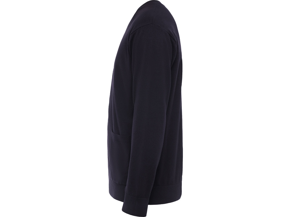 Трикотажный кардиган с застежкой на пять пуговиц. Два накладных кармана. Манжеты и низ вывязан рибом.