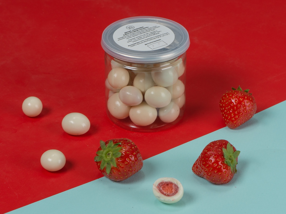 Состав: йогуртовая глазурь (сахар, молоко сухое обезжиренное, какао-масло, сыворотка молочная сухая, йогуртовый порошок натуральный (молоко обезжиренное питьевое пастеризованное, мальтодекстрин, молочная кислота), эмульгатор лецитин, сублимат клубники. Тампопечать (1 цвет (белые изделия)) на данный товар осуществляется бесплатно. Оплачивается только настройка оборудования в размере 4000 рублей на весь тираж.