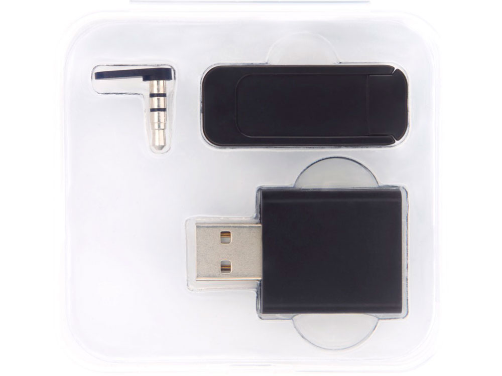 Комплект для обеспечения конфиденциальности цифровых данных с блокиратором данных USB, блокиратором веб-камеры и блокиратором аудиоразъема. Защитник данных USB предотвращает случайный обмен данными при подключении мобильного устройства к компьютеру или общественной зарядной станции. Это изделие блокирует любую передачу данных во время зарядки устройства, предотвращая кражу данных или установку вредоносных программ. Блокиратор веб-камеры можно прикрепить перед веб-камерой ноутбука, чтобы заблокировать нежелательный доступ к веб-камере. Блокиратор аудиоразъема можно поместить в AUX-порт устройства, чтобы избежать прослушивания разговоров третьими лицами. Поставляется в защитном футляре. Пластик ABS. Тампопечать (1 цвет (белые изделия)) на данный товар осуществляется бесплатно. Оплачивается только настройка оборудования в размере 4000 рублей на весь тираж.
