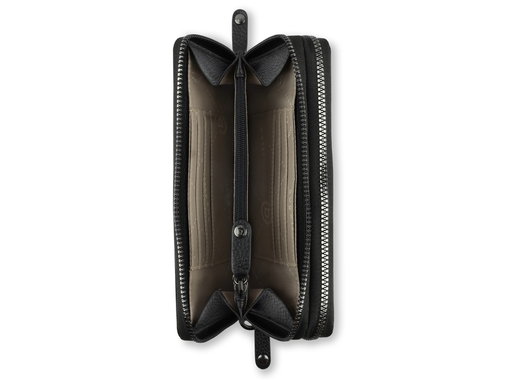 Функциональная организация: 2 отделения на молнии, 23 слотов для карт, 5 карманов, 2 отделения для купюр, сетчатый карман, отделение для монет на молнии, ремешок на запястье с карабином, защита данных RFID.