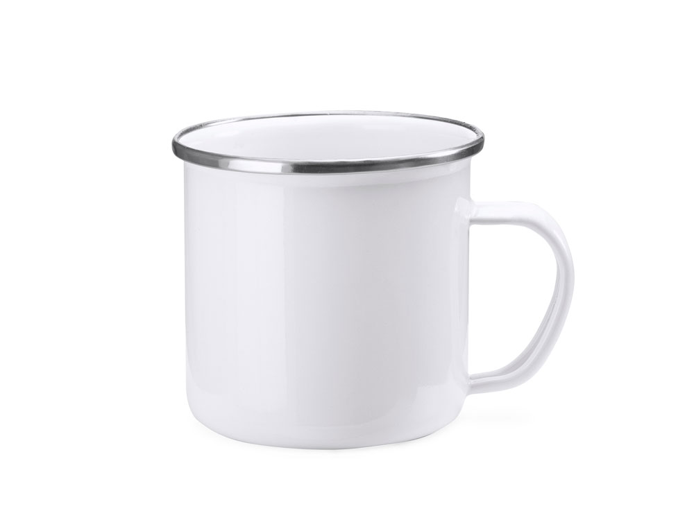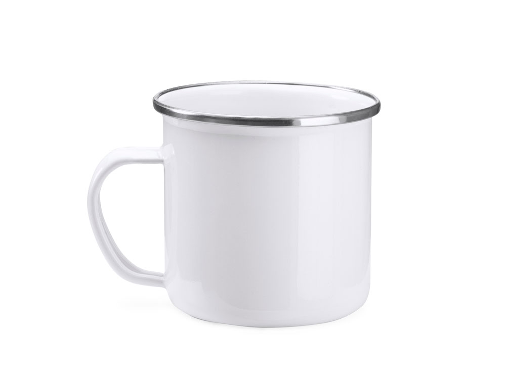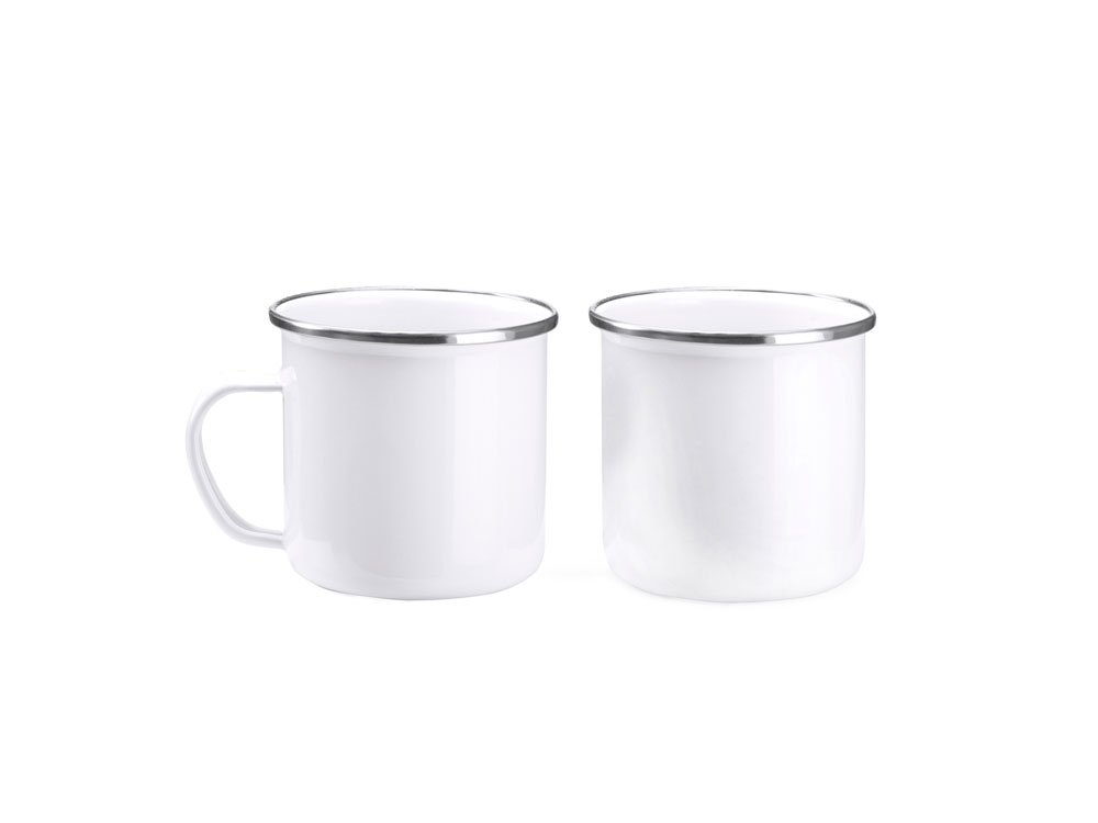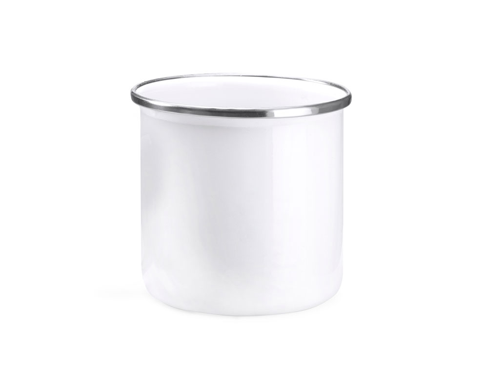 Металлическая эмалированная кружка объемом 380 мл с серебряным ободком и специальным покрытием для сублимации.