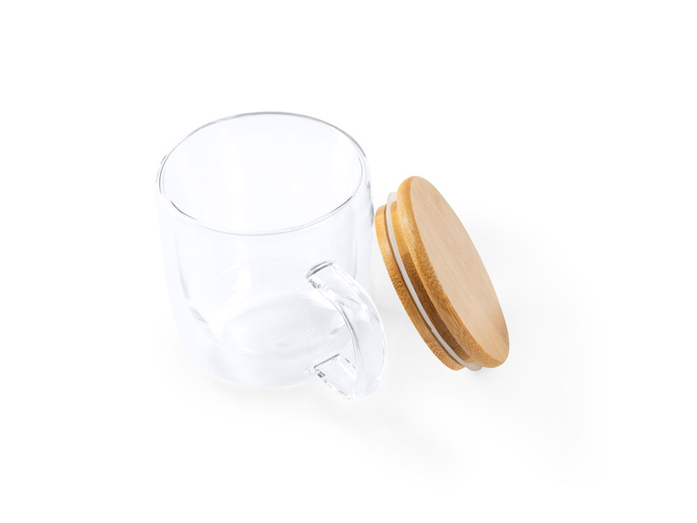 Кружка с двойными стенками из боросиликатного стекла с бамбуковой крышкой. Объем 280 мл.