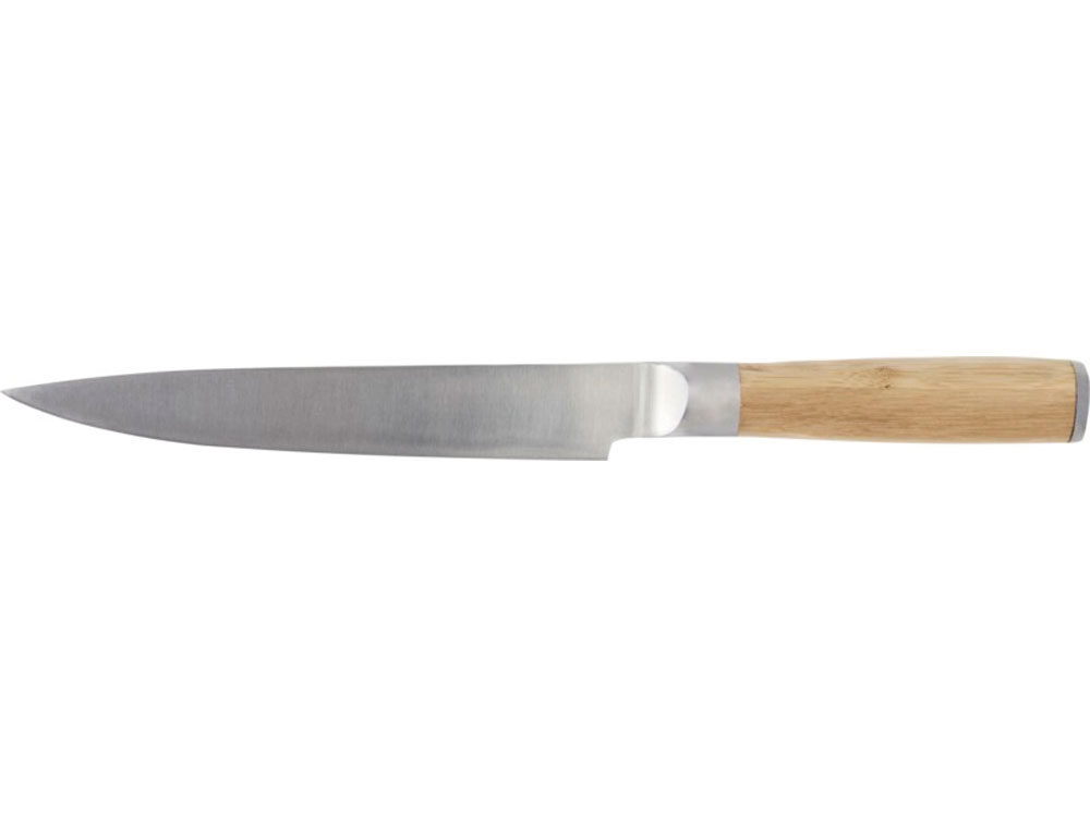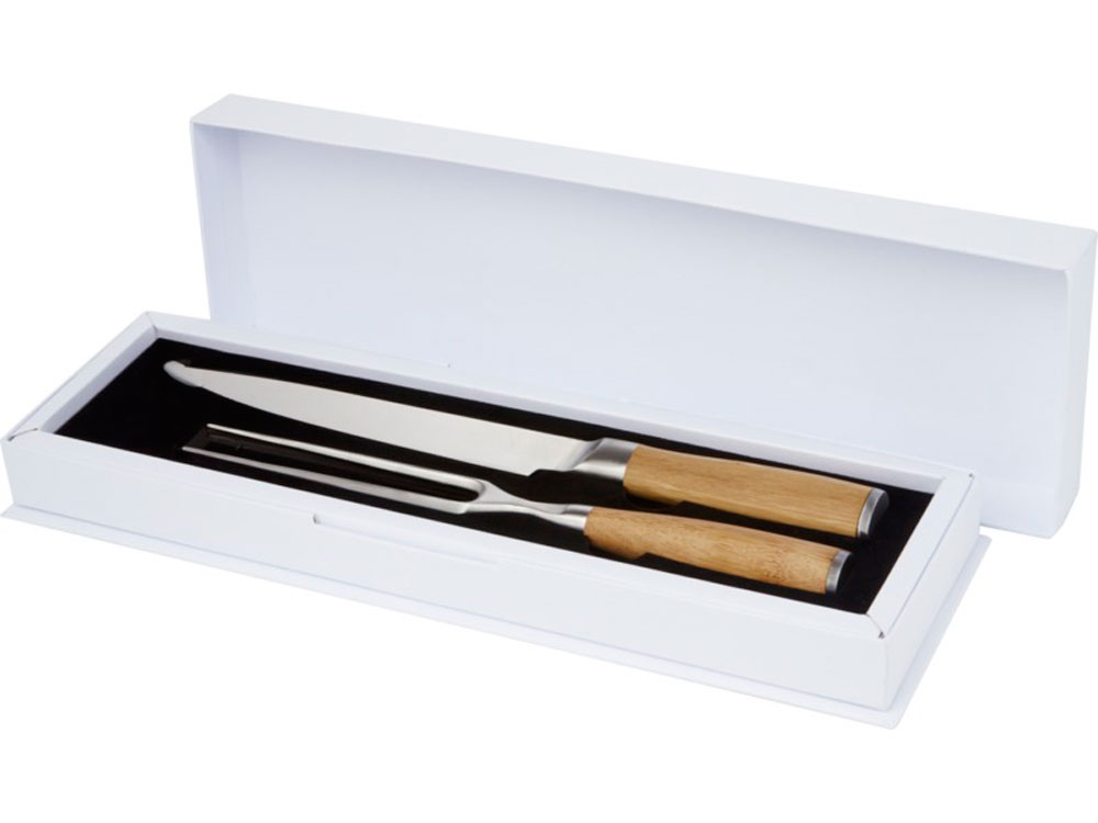 Разделочный нож и вилка с бамбуковыми ручками. Размер ножа: 33,2 см x 3,1 см. Размер вилки: 29,2 см x 2,5 см.