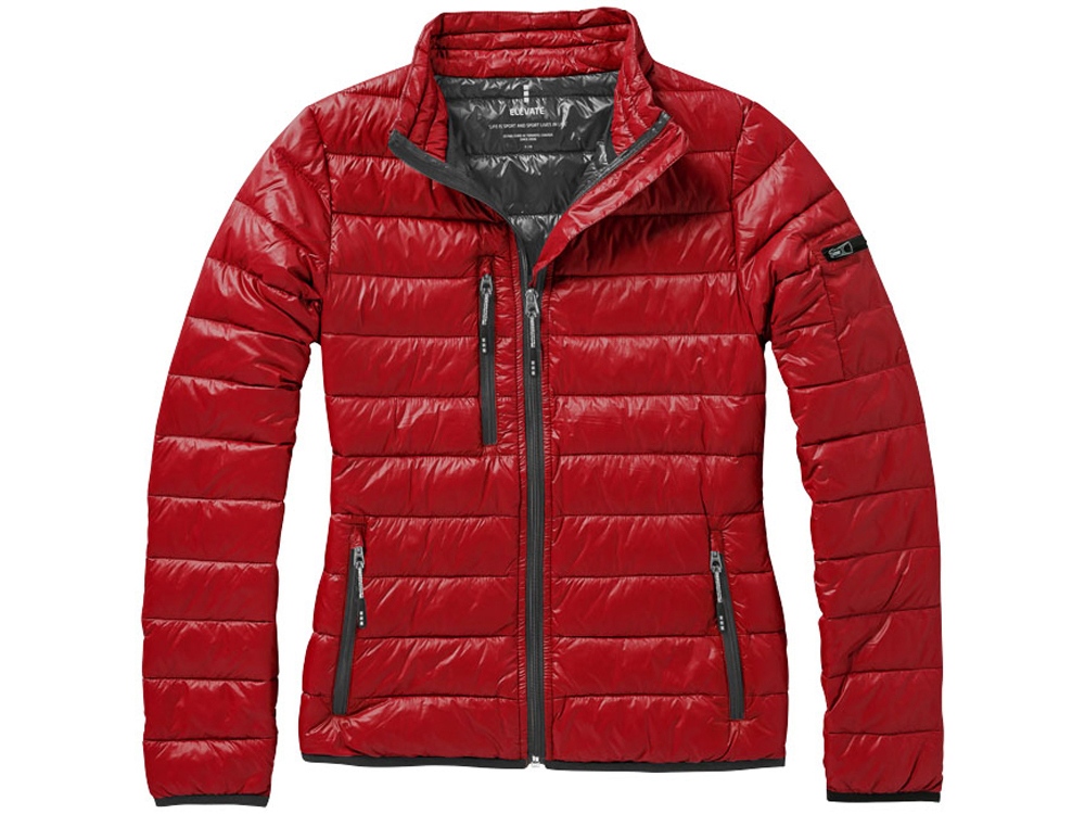 Женская легкая куртка Scotia. Стандартный покрой. Ткань не пропускает пух. Карманы для рук и нагрудный на молнии. Карман на рукаве на молнии можно использовать для нанесения. Резинка на манжетах и внизу куртки. Ремешки на собачку (второй комплект в цвете антрацит). Внутренний противоветровой клапан и защита подбородка. Ткань дышащая, ветронепроницаемая и влагоотталкивающая. Отражающий лого сзади. Легкий пуховик. Ткань из 100% нейлона с матовым и блестящим водоотталкивающим покрытием, 20D. 80% пух и 20% перо. 115 г/м². Термотрансфер (1 цвет (цветные изделия)) на данный товар осуществляется бесплатно. Оплачивается только настройка оборудования в размере 9200 рублей на весь тираж.