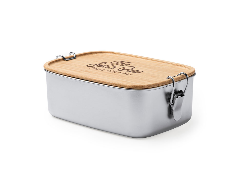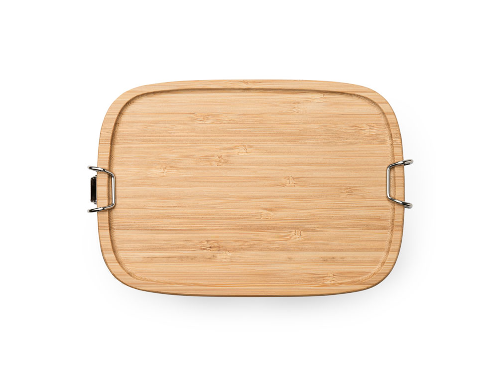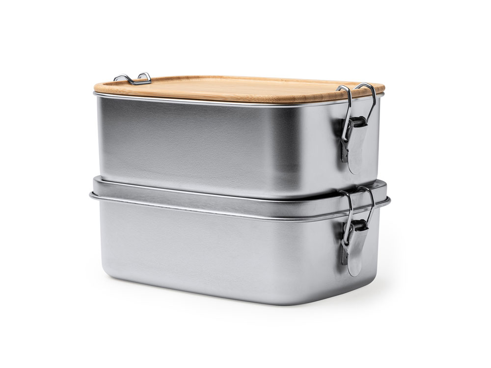 Ланч-бокс из нержавеющей стали 304 с бамбуковой крышкой с системой закрытия с помощью боковых пряжек. Большая емкость 1 л для хранения продуктов.