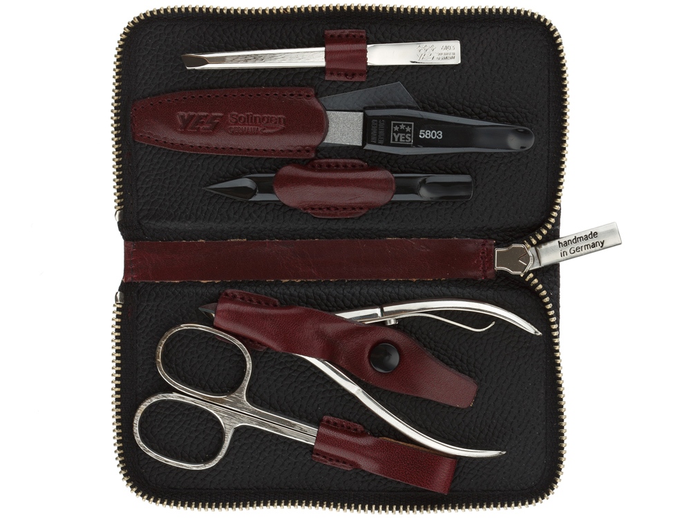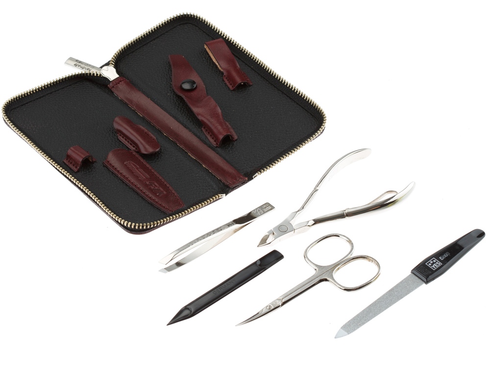 Элегантный чехол на молнии выполнен из натуральной итальянской воловьей кожи, инструменты изготовлены из углеродистой стали превосходного качества.