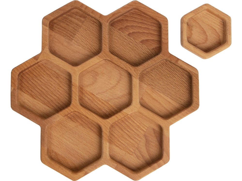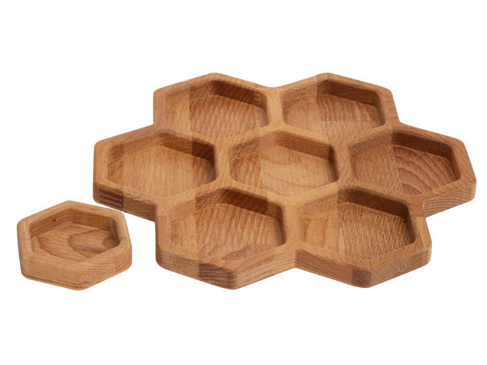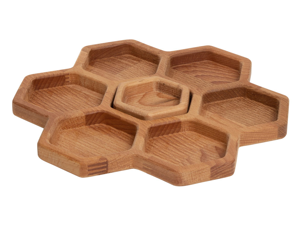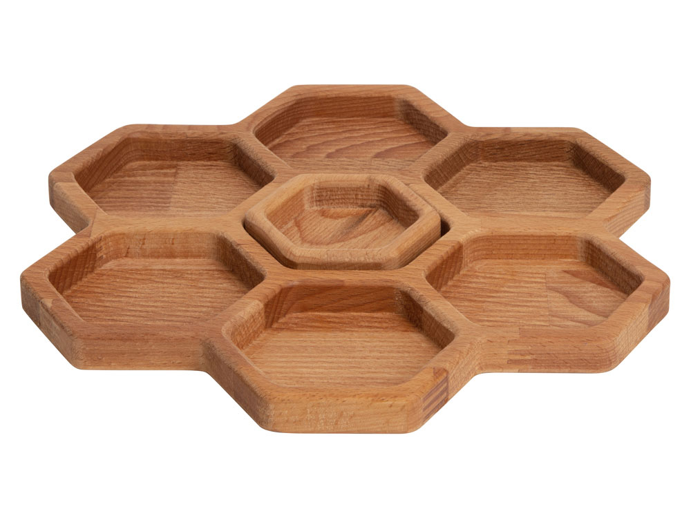 Менажница выполнена в виде семи сот для разных видов закусок — за бонусную дополнительную отвечает съемная сота-соусница, в которую можно залить мед или любимый соус.