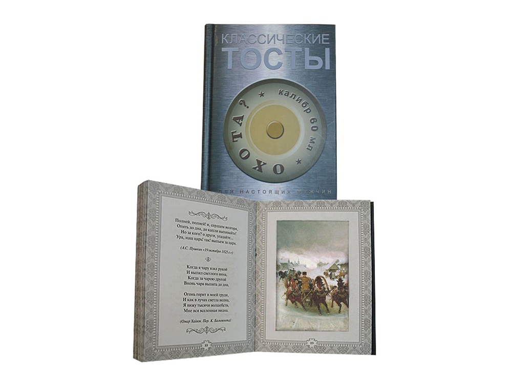 Внутри — три стопки, а также там можно найти и подарочную книгу «Классические тосты»