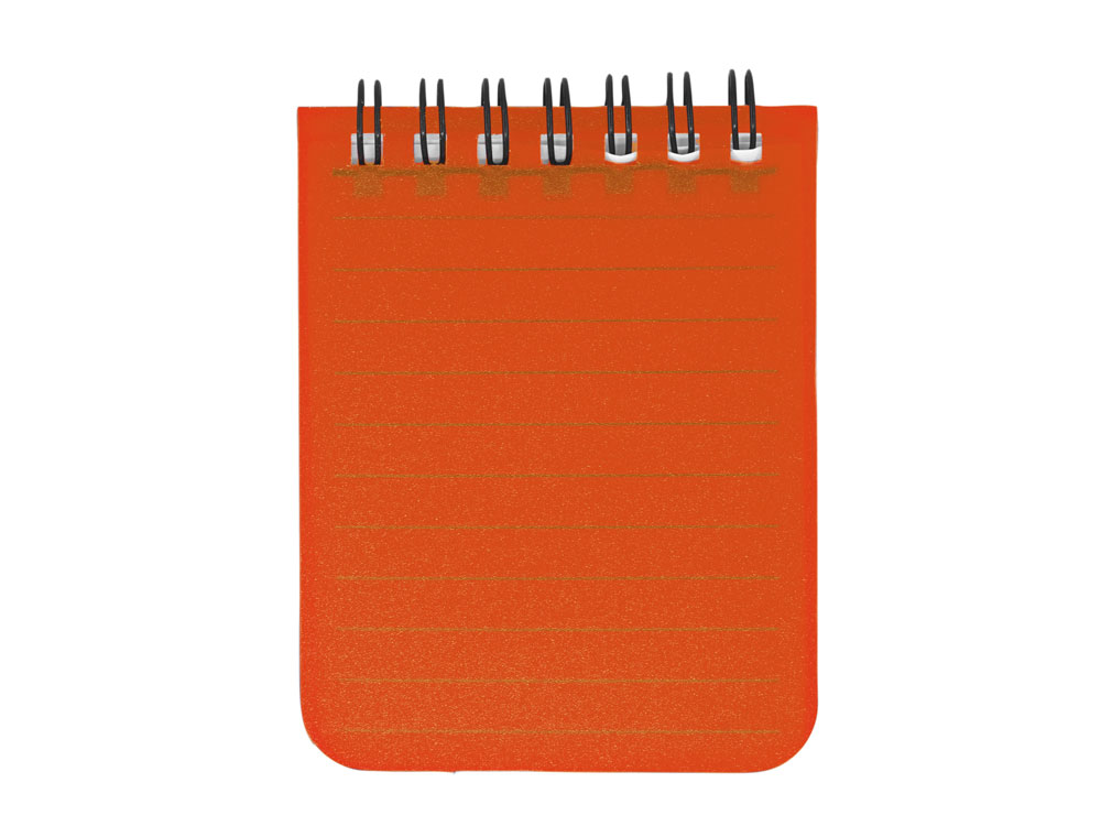 Мини-блокнот на спирали с жесткой полипропиленовой обложкой. 60 листов линованной бумаги. В комплект входит шариковая ручка с синими чернилами.