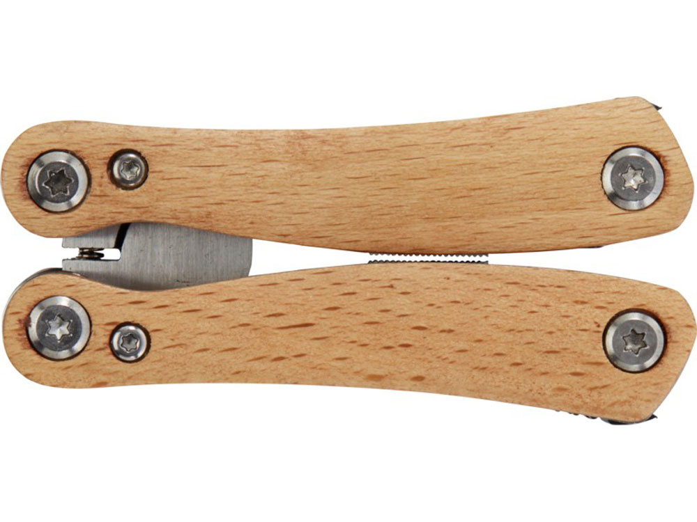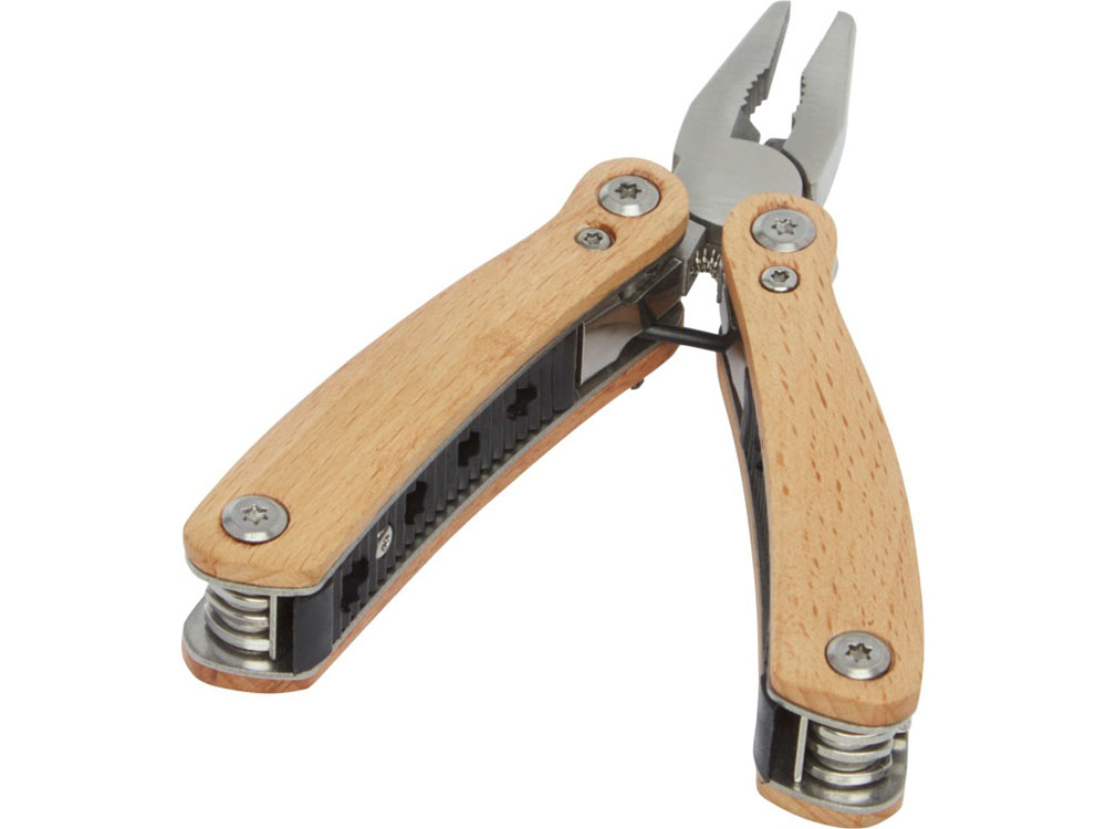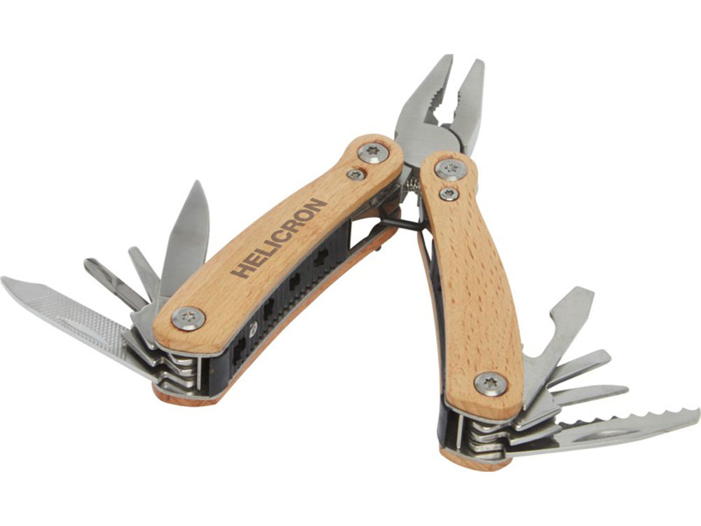 Прочный и долговечный компактный многофункциональный инструмент из высококачественной нержавеющей стали с рукоятками из буковой древесины. Это обязательный инструмент для любого скаута, мастера и любителя отдыха на природе. Имеет 12 функций: плоскогубцы с большими концами, стандартные плоскогубцы, кусачки, зазубренное лезвие, открывалка для бутылок/банок, плоская отвертка, плоская отвертка среднего размера, маленький нож, крестообразная отвертка, нож среднего размера и напильник, а также очиститель напильника. Используемая буковая древесина поступает от надежных поставщиков, соблюдающих все экологические и социальные нормы. Размер в открытом состоянии 11 x 6 см, а в закрытом — 7,2 x 3,4 см. Поставляется с инструкцией по эксплуатации и упакован в подарочную коробку из переработанного картона размером 9,5 x 5,5 x 2,5 см.