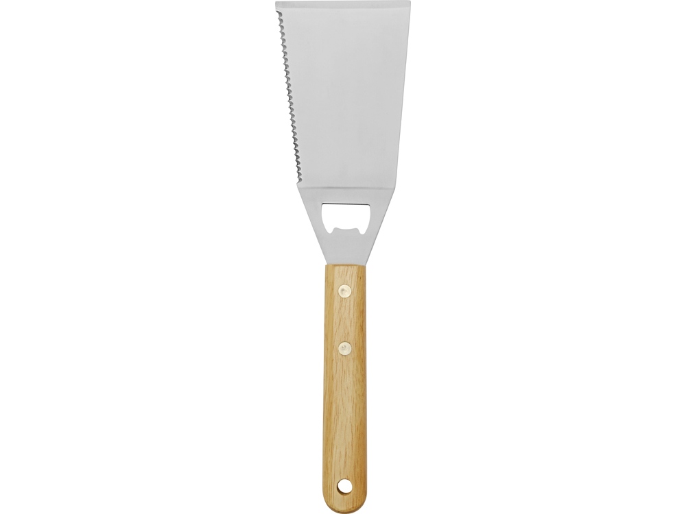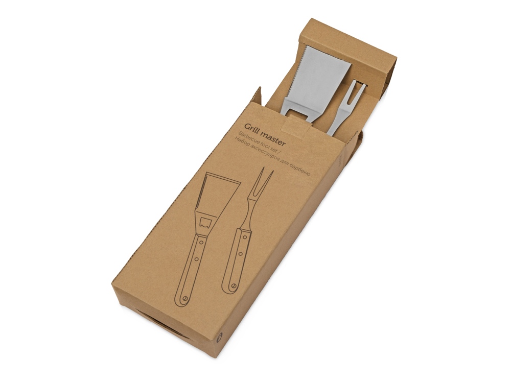 Набор аксессуаров для барбекю «Grill Master» с деревянными ручками состоит из двух предметов: лопатки и вилки. Лопатка также имеет дополнительную функцию — открывалки для бутылок. Набор поставляется в крафтовой коробке с окошком. Гравировка (CO2 лазер) (Без чернения) на данный товар осуществляется бесплатно. Оплачивается только настройка оборудования в размере 1000 рублей на весь тираж.