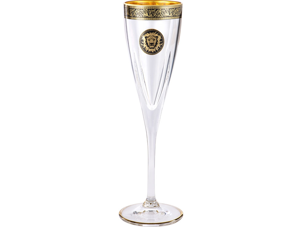 Оригинальный набор бокалов для шампанского, задекорированных золотистым изображением царя зверей – могучего льва. Бокалы выполнены из прозрачного хрусталя с золотистой отделкой по краю и на ножке. Набор рассчитан на 6 персон. Упакован в деревянную коробку. Гравировка (CO2 лазер) (Без чернения) на данный товар осуществляется бесплатно. Оплачивается только настройка оборудования в размере 1000 рублей на весь тираж.